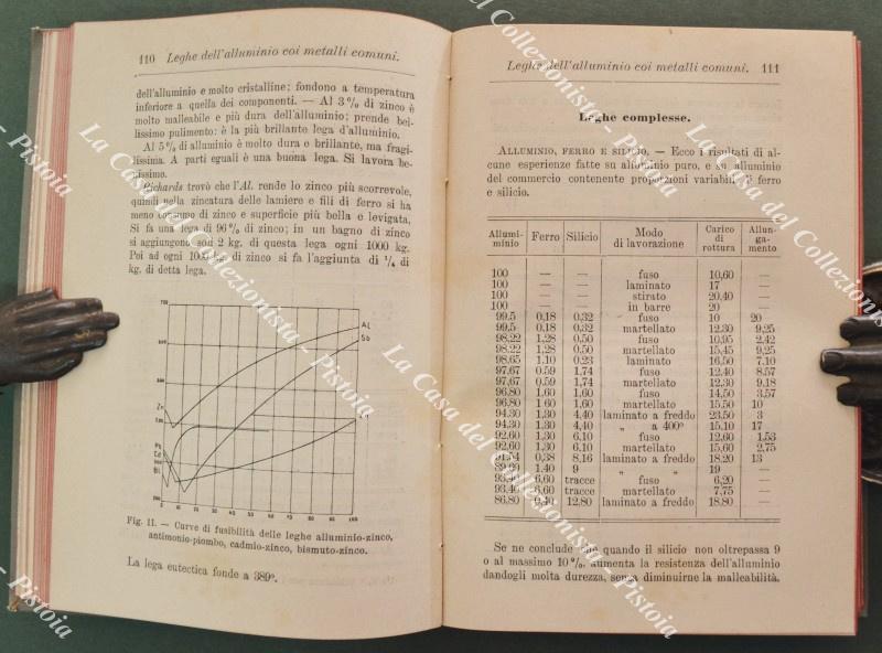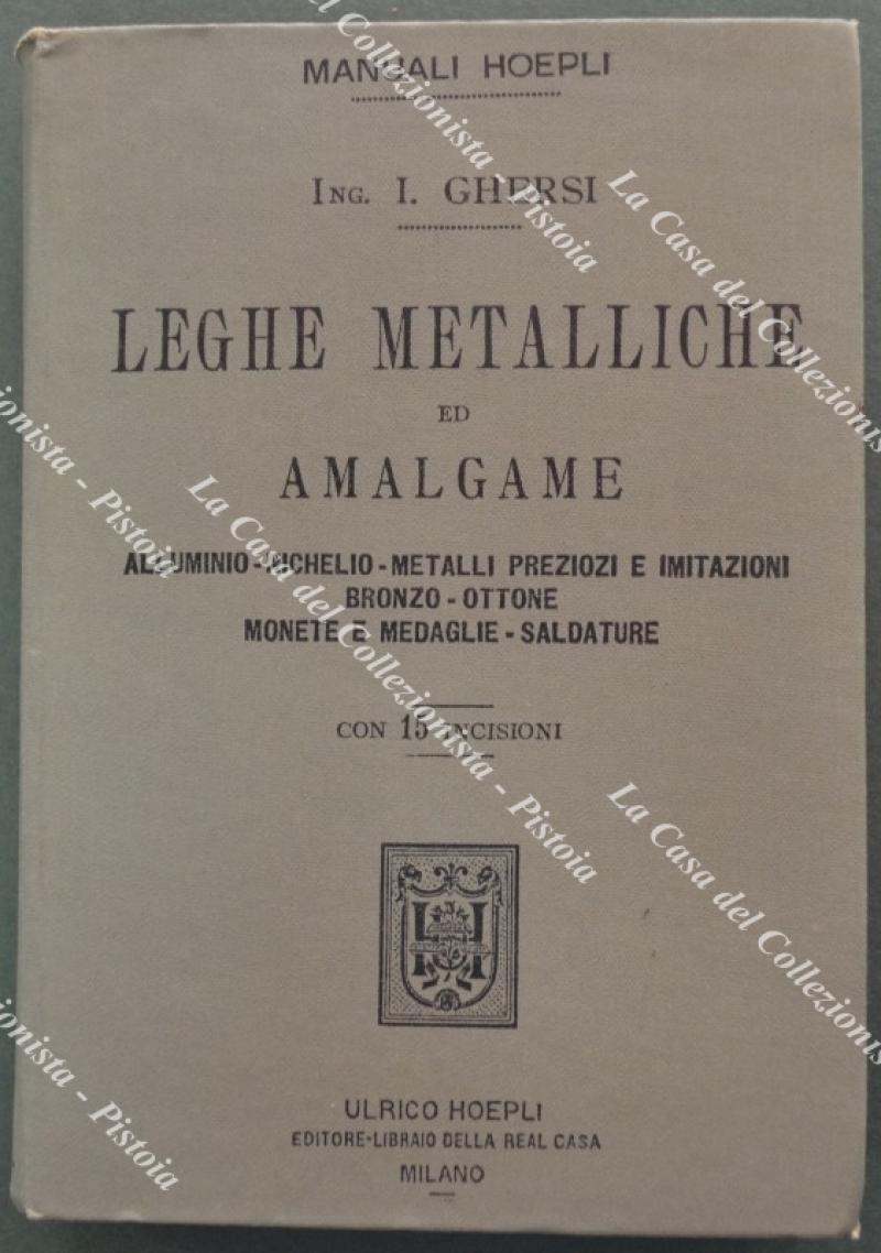 (Manuali Hoepli) GHERSI I.. LEGHE METALLICHE ED AMALGAME. Alluminio - Nichelio - Metalli preziosi e imitazioni - Bronzo - Ottone - Monete e medaglie - Saldature. Milano, Hoepli, 1898 (prima edizione). In 16° (cm 11x15.5), tela editoriale, pp. XII + 431. Ottima conservazione. (Rif.F7881)