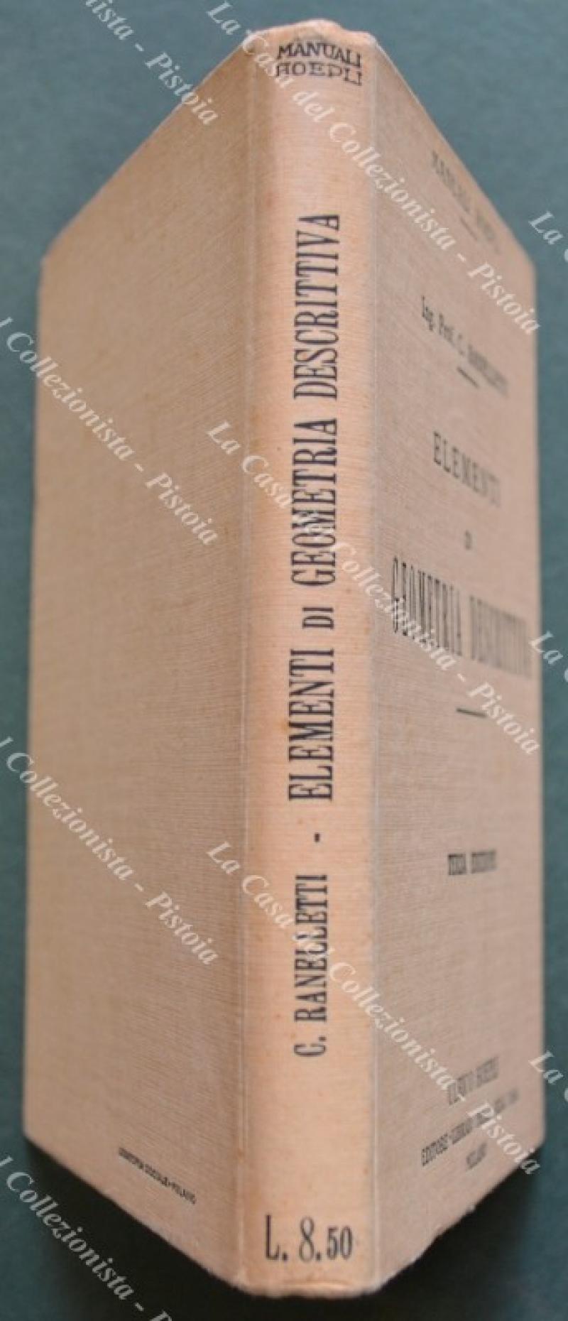 (Manuali Hoepli) Ranelletti C.. ELEMENTI DI GEOMETRIA DESCRITTIVA. Terza edizione. Milano, Hoepli, 1923. In 16° (cm 10,5x15,5), tela editoriale, pp. XII + 197 con 141 incisioni. Ottima conservazione. (Rif.F5284)