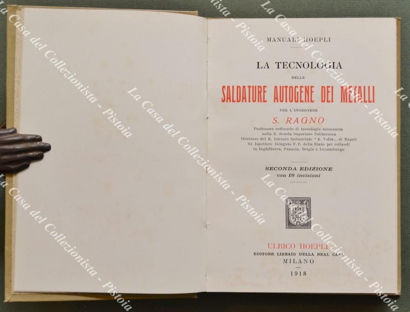 (Manuali Hoepli) REGNO S.. La tecnologia delle saldature autogene dei metalli. Seconda edizione con 18 incisioni. Milano, Hoepli, 1918. Cm 10x15, tela editoriale, pp. VI + 1129. Conservazione ottima eccetto lievi ingiallimenti. (Rif.F2369-478/75)