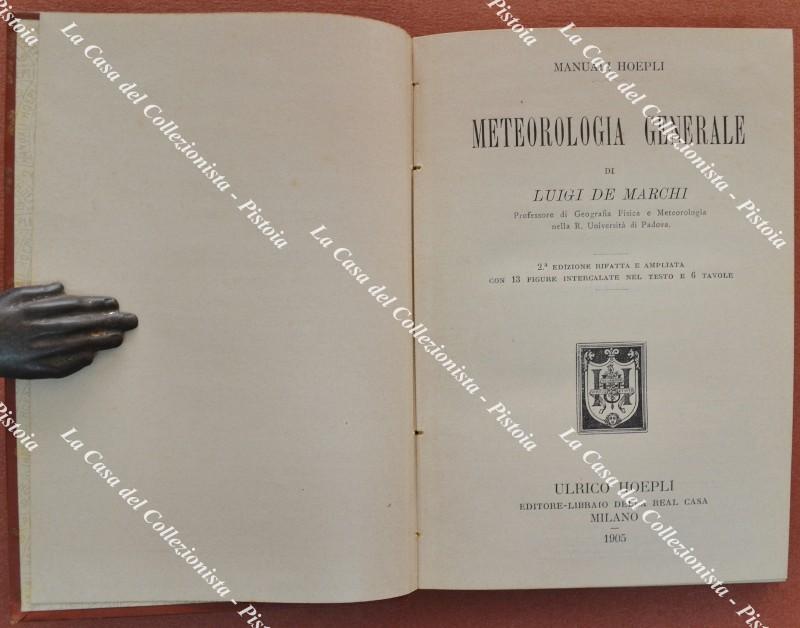 (Manuali Hoepli) DE MARCHI LUIGI. METEOROLOGIA GENERALE. Seconda edizione rifatta e ampliata con 13 figure intercalate nel testo e 6 tavole. Milano, Hoepli, 1905. In 16°, tela edit., pp. XIII + 225. Ottima conservaz.. (Rif.F6634-76)