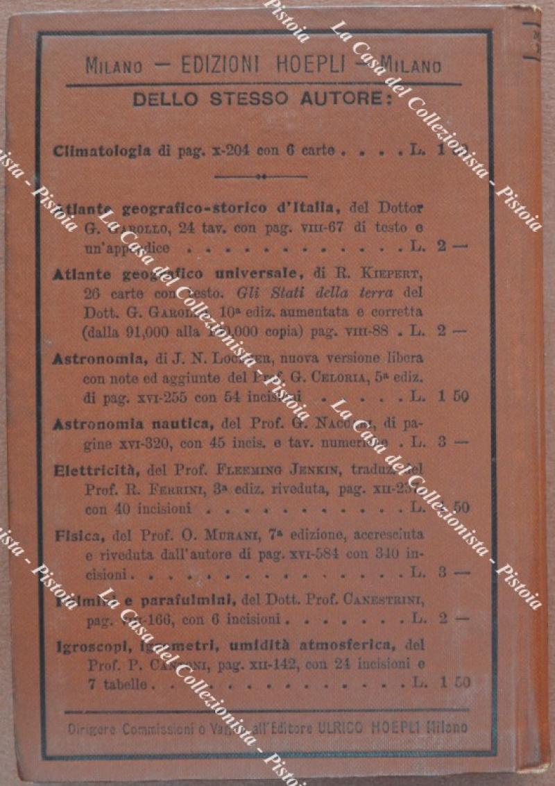 METEOROLOGIA GENERALE. Seconda edizione rifatta e ampliata con 13 figure intercalate nel testo e 6 tavole. Milano, Hoepli, 1905.