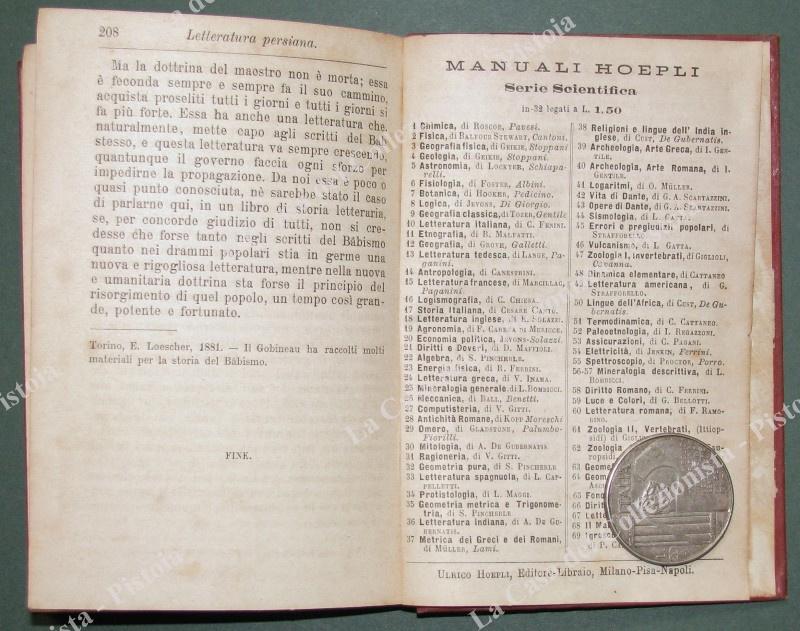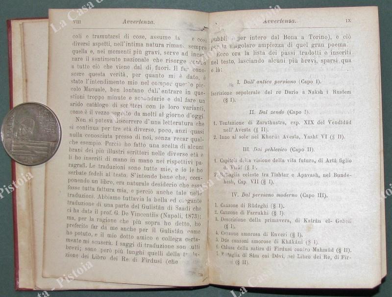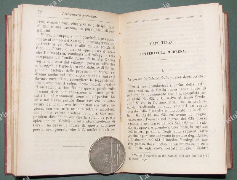 PIZZI ITALO. "MANUALE DI LETTERATURA PERSIANA". Milano, Hoepli, 1837. In 16°, tela editoriale, pagine X + 208. Piccole usure. (Rif.D9647)