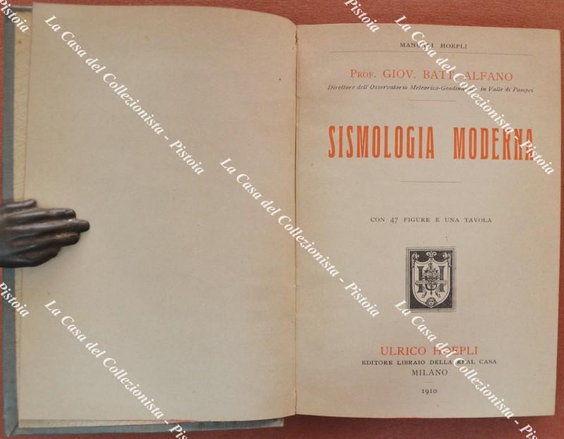 (Manuali Hoepli) ALFANO G.B.. SISMOLOGIA MODERNA. Milano, Hoepli, 1910. In 16°, tela editoriale illustrata, pp. XI + 357 con 47 figure e una tavola. Ottima conservaz.. (Rif.F6640-76)