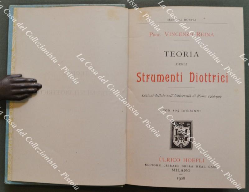 (Manuali Hoepli) REINA V.. Teoria degli strumenti diottrici. Lezioni dettate nell’Università di Roma 1906 - 1907. Milano, Hoepli, 1908. Cm 10x15, cartonatura editoriale, pp. XIII + 220 con 103 incisioni. Ottima conservazione. (Rif.F2363-472/75)