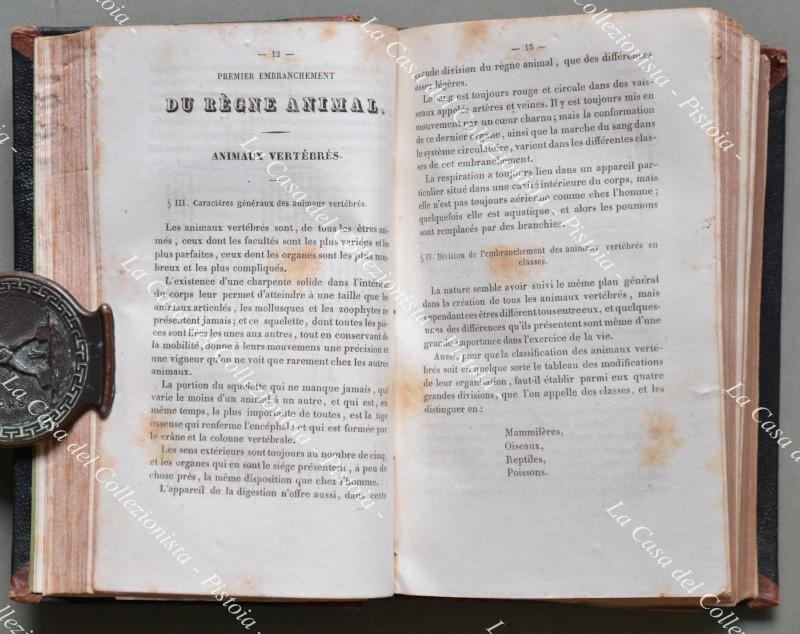 (Storia naturale – ediz. ‘800 ill.) MILNE E. – COMTE A.. COURS D’HISTOIRE NATURELLE. A l’usage des colleges e des ecoles normales primaires. Bruxelles, Meline, 1840. In 16° (cm 10,5x17,5). Mezza pelle coeva con titolo in oro al dorso. L’opera si compone di 6 parti: 1) Zoologia. Nozioni generali. Pp. 123 + 6 tavole fuori testo. 2) Zoologia. Mammiferi. P. 146 + 6 tavole fuori testo. 3) Uccelli. Pp. 108 + 6 tavole fuori testo. 4) Zoologia. Rettili, pesci e molluschi. Pp. 88 + 5 tavole fuori testo. 5) Zoologia. Animali articolati e zoofiti. Pp. 72 + 5 tavv. fuori testo. 6) Botanica e zoologia. Pp. 150 + 7 tavole fuori testo. Legatura solida (minimi segni d’uso), interno in buona conservazione, eccetto ingiallimenti alle pagine. (Rif.C7731-560/69)