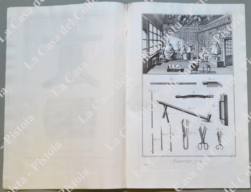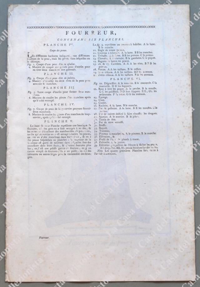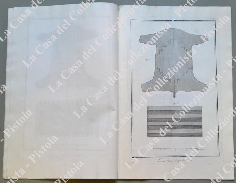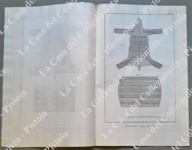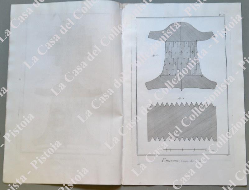 ANNO 1781. PELLICCIAIO, “FOURREUR”. Pagine 1 di testo e 6 tavole con esempi di taglio, artigiani al lavoro e loro utensili. Fascicolo tratto da DIDEROT ET D’ALEMBERT. Encyclopedie metodique ou dictionnaire raisonné des sciences, des arts et des metiers …. Grandiosa opera in folio (circa cm 26x39) edita nella II° metà del 1700. Buona conservazione. (Rif.D5374 - 289/69)
