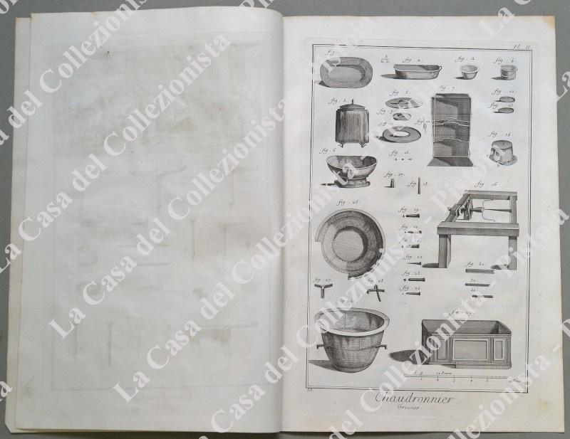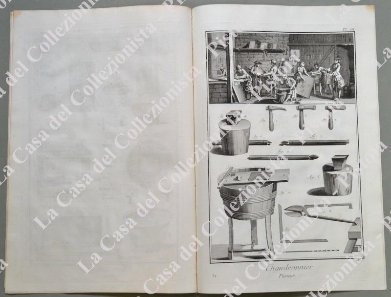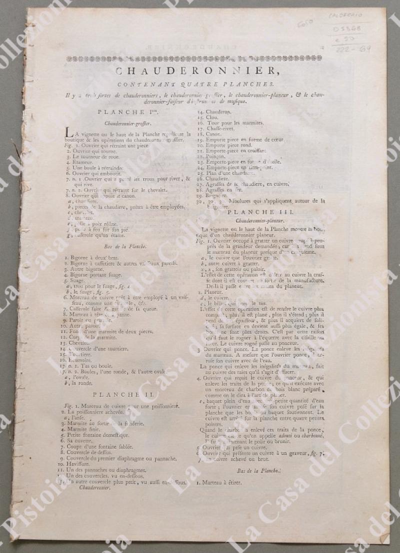 ANNO 1781. CALDERAIO, “CHAUDERONNER”. Pagine 2 di testo e 4 tavole raffiguranti artigiani al lavoro, utensile e manufatti. Fascicolo intero tratto da DIDEROT ET D’ALEMBERT. Encyclopedie metodique ou dictionnaire raisonné des sciences, des arts et des metiers …. Grandiosa opera in folio (circa cm 26x39) edita nella II° metà del 1700. Ottima conservazione. (Rif.D5368 - 222/69)