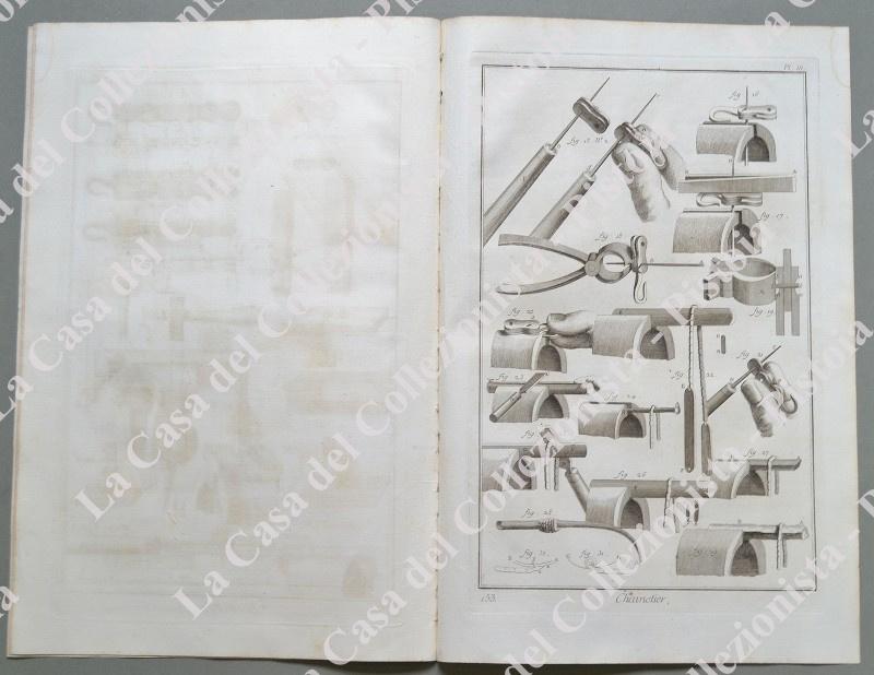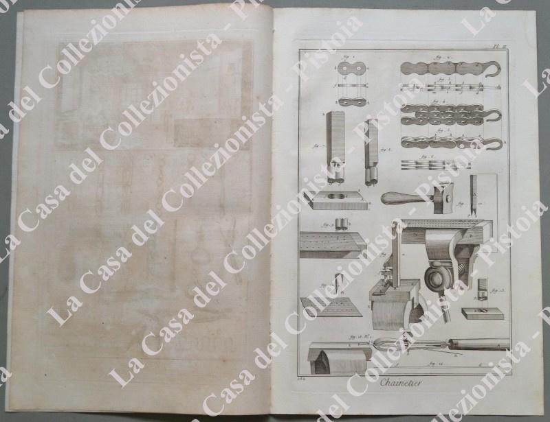 ANNO 1781. FABBRICANTE DI CATENE, “CHAINETIER”. Pagine 1 di testo e 3 belle tavole (operai al lavoro, utensili e manufatti). Fascicolo intero tratto da DIDEROT ET D’ALEMBERT. Encyclopedie metodique ou dictionnaire raisonné des sciences, des arts et des metiers …. Grandiosa opera in folio (circa cm 26x39) edita nella II° metà del 1700. Ottima conservazione. (Rif.D5337 - 248/69)