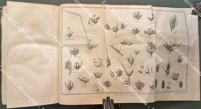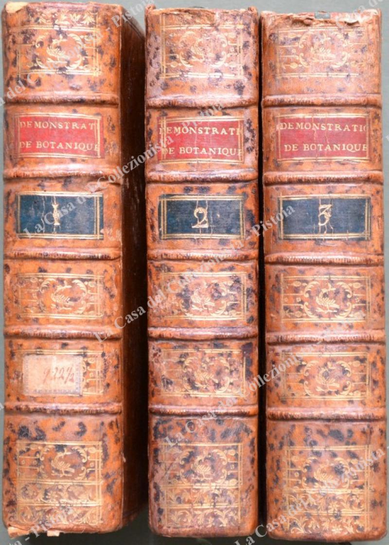 (Botanica – ediz. ‘700 illustrata) ROZIER FRANCOIS. DEMOSTRATIOS ELEMENTAIRES DE BOTANIQUE, CONTENANT les Principes généraus de cette Science, l’explication des termes, les fondemens des Méthodes, & les élémens de la physique des végétaux. La description des Plantes les plus communes, les plus curieuses, les plus utiles, rangées suivant la Méthode de M. DE TOURNEFORT & celle du Chevalier LINNE’. Leurs usage & leurs propriétés dans les Arts, l’economie rurale, dans la Médicine humaine & Vétérinaire; ainsi qu’une instruction sur la formation d’un Herbier, sur la dessication, la maceration, l’infusion des plantes, Ec. Troisieme edition, corrigée & considerablement augmentée. Lione, Bruyset, 1787. In 8° (cm 12x20), legature coeve in piena pelle con nervi, tasselli e tit. in oro ai dorsi. 3 volumi : 1) Pp. LII + 176 + 8 tavole ripieg. fuori testo (I – VIII) + pp. XXIV con una tavola ripieg. fuori testo (IX) + pp. 482 + 2 tavole ripieg. fuori testo (X – XI). 2) Pp. LXXXVIII + 580. 3) Pp. 720 + 2 tavole ripieg. fuori testo (XII – XIII). Opera rara, collazionata e completa. Interno in ottima e fresca conservazione, legature solide, ma con qualche segno d’usura (in particolare mancano i capitelli alla parte superiore del dorso di due volumi). (Rif.C8244-418/70)