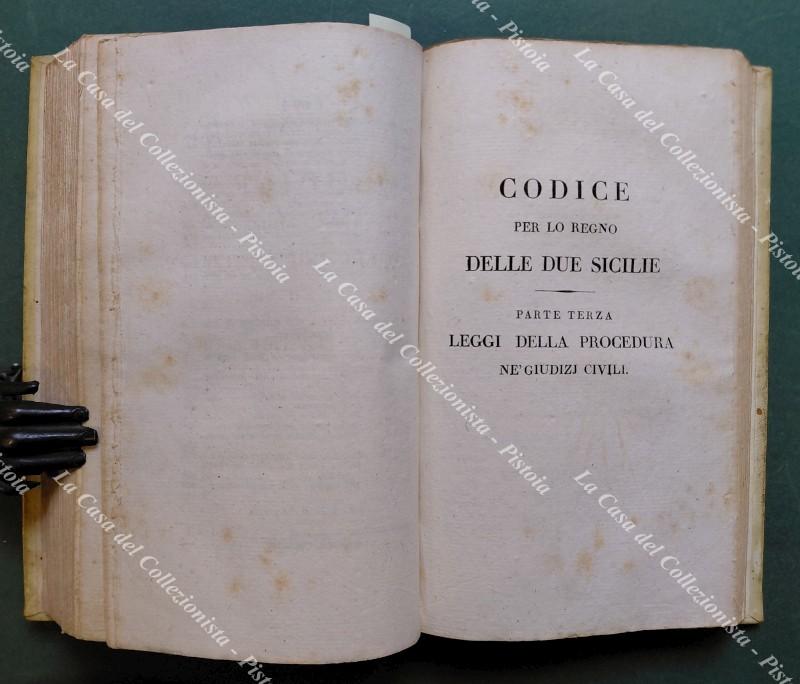 CODICE PER LO REGNO DELLE DUE SICILE. Napoli, Stamp. Reale, 1827. Cm 12x22, legatura coeva in piena pergamena con tasselli al droso. Volume contenente: PARTE PRIMA. LEGGI CIVILI. P. XIII + pp. 445 + pp. XIX *** PARTE TERZA. LEGGI DELLA PROCEDURA NE' GIUDIZI CIVILI. Pp. XIII + pp. 256 + pp. XVI. Volume ben solido, pergamena e interni buoni, qualche ingiallimento alle pagine. (Rif.F7087)
