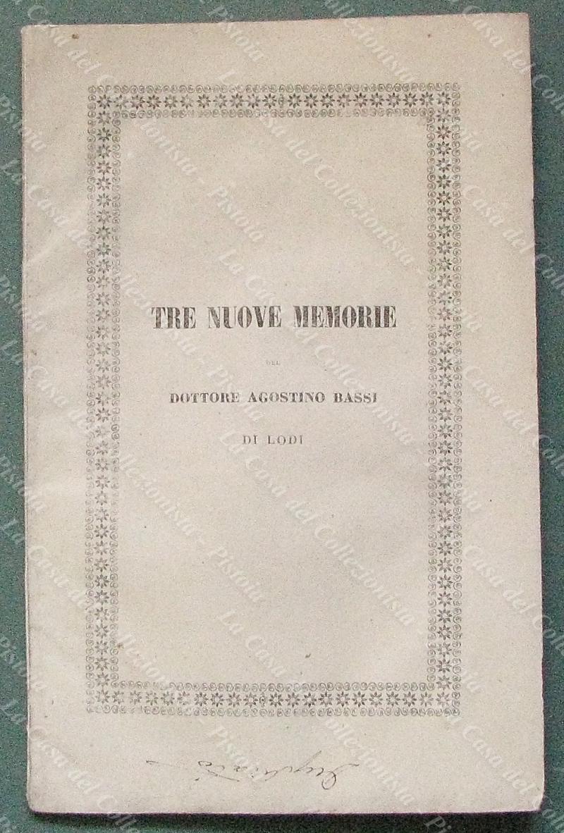 COLTURA DEI GESSI-MIGLIOR METODO DI FARE E CONSERVARE LUNGAMENTE I VINI-DEI CONTAGI IN GENERALE. 3 nuove memorie del Dr. Agostino Bassi. Lodi, Tip. Wilmant, 1844. Cm 14x21, brossura originale, pagine 60. Buona conservazione. (Rif.E5834)