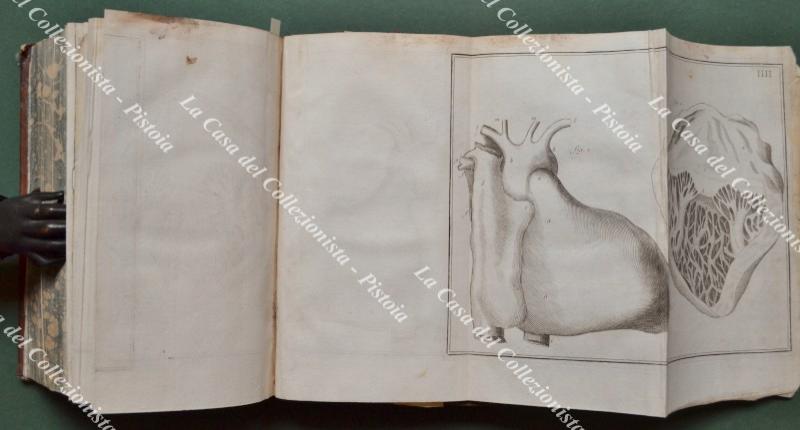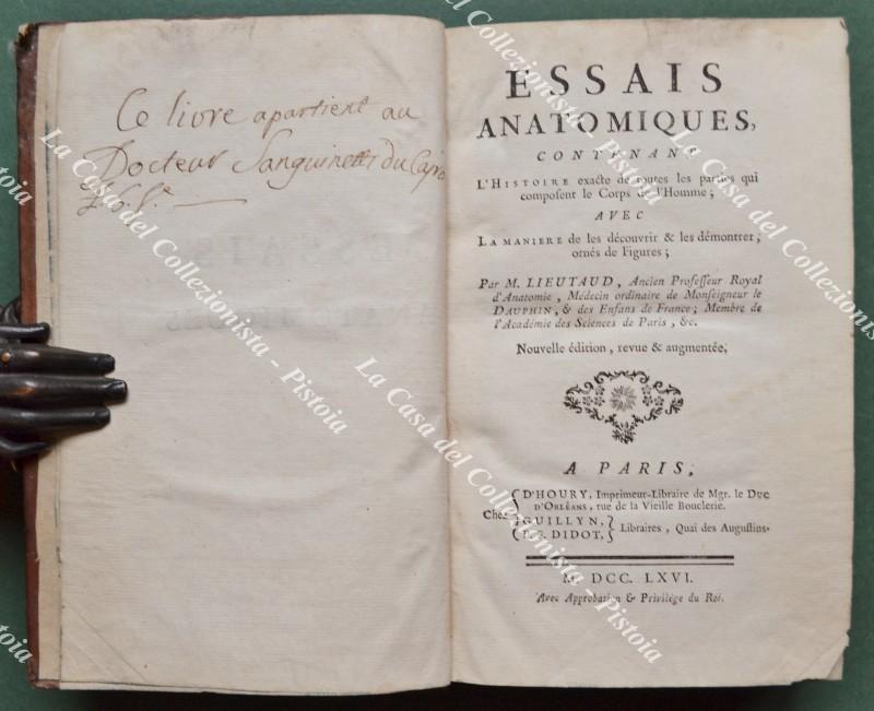 (Anatomia - figurato '700) LIEUTAUD JOSEPH. ESSAIS ANATOMIQUES, contenent L'HISTOIRE exacte de toutes les parties qui composent le Corps de l'Homme; AVEC LA MANIERE de les découvrir & les démontrer, ornés de Figures; ... Nouvelle édition, revue & augmentée. Parigi, D'Houry - Guillyn - Didot, 1766. Cm 12.5x20, legatura coeva in piena pelle con al dorso nervi e fregi in oro. Pp. (4) + XXII + (2) + 730 + XXVI con fuori testo alla fine 6 tavole incise in rame ripiegate. Opera collazionata e completa. Volume solido, difetti alle punte della legatura. Segno di muffa al margine superiore bianco delle prime cento , ultime venti pagine e al bordo superiore delle tavole. (Rif.F7659-77)