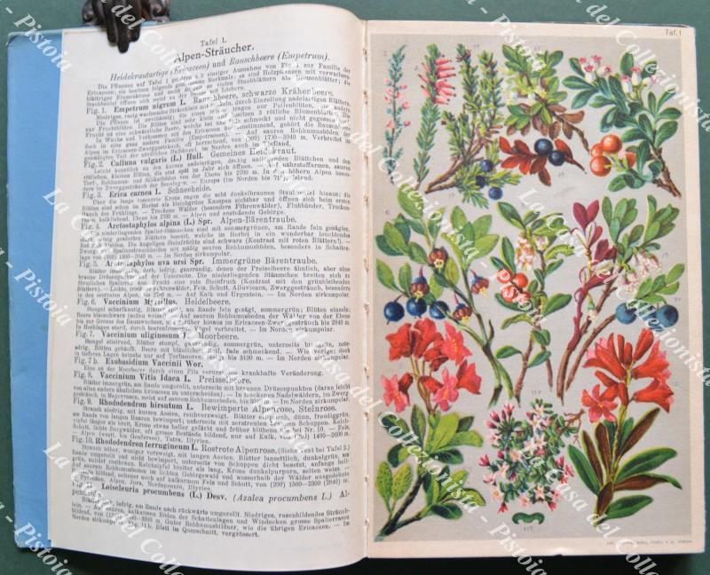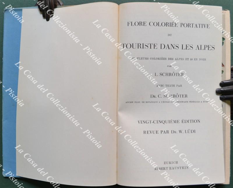 (Botanica) SCHROTER L. - SCHROTER C.. FLORE COLORIEE PORTATIVE DU TOURISTE DANS LES ALPES. Zurigo, Raustein, circa 1930. Cm 13x20,5, tela verde editoriale con impressioni in oro e sovracoperta. 25 tavole a colori con 207 figure + relative pagine descrittive. Buona conservaz.. (Rif.F0780-74)