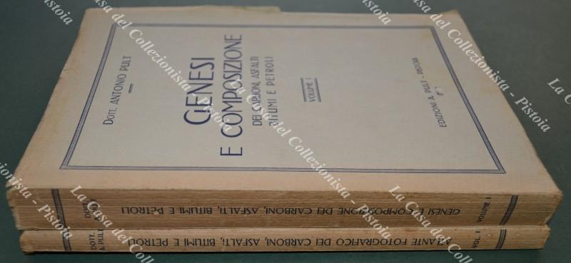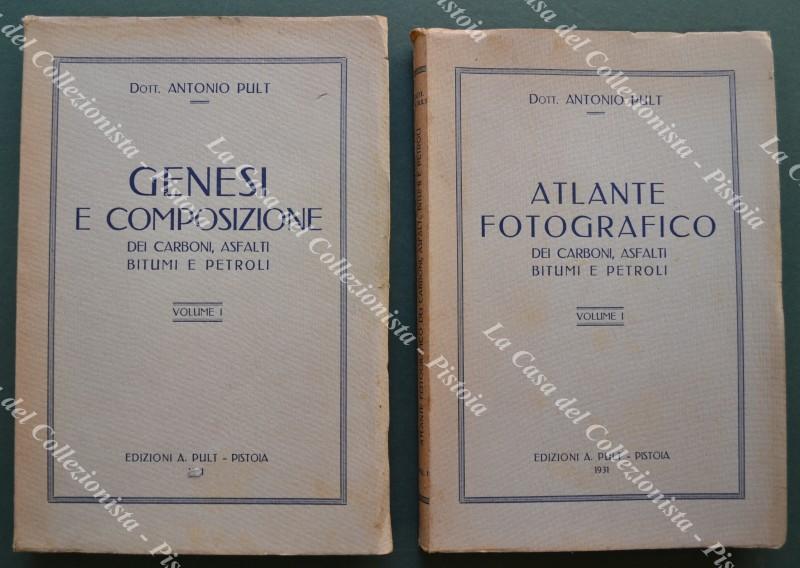 (Geologia) PULT ANTONIO. GENESI E COMPOSIZIONE DEI CARBONI, ASFALTI, BITUMI E PETROLI --- ATLANTE FOTOGRAFICO DEI CARBONI, ASFALTI BITUMI E PETROLI. Pistoia, Edizioni Pult, 1931. Cm 16x24, copertine editoriali. Pagine 362 per il primo volume, tavole 89 con didascalie al secondo. Il volume primo è il solo pubblicato. Buona conservazione eccetto segni di aderenze alla carta patinata delle pagine dell'atlante. (Rif.F3901)