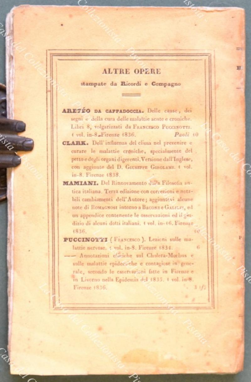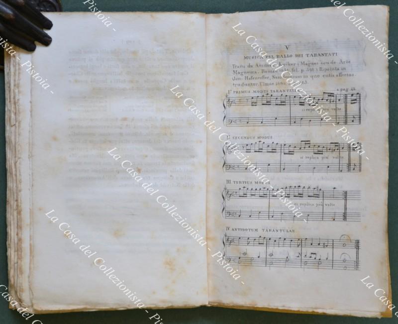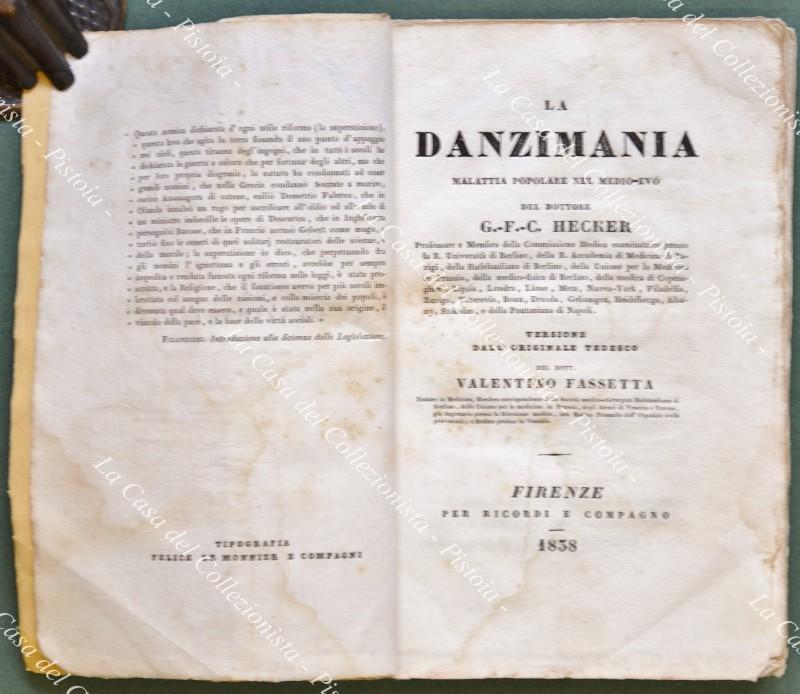 (Medicina) HECKER G.F.C.. LA DANZIMANIA. Malattia popolare nel medioevo. Versione dal tedesco del Dr. Valentino Fassetta. Firenze, Ricordi & Compagno, 1838. In 16° (cm 11x17), brossura originale (restauro al dorso). Pp. 130 + (6) contenenti la musica del ballo dei tarantati e l’indice. Buona conservazione eccetto lievi ingiallimenti. La Danzimania, forma di nevrosi collettiva, più nota come ballo di San Vito, fu assimiliata in passato a malattia isterica. L’autore, per primo, considerò questa malattia sotto il profilo storico, sociale, economico e religioso. (Rif.D9101-490/72)