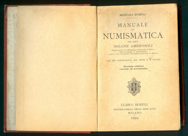 (Manuali Hoepli) AMBROSOLI SOLONE. Manuale di numismatica. Seconda edizione corretta e accresciuta. Milano, 1895, in 16°, tela editoriale, pagine XV + 250 con 120 fotoincisioni nel testo e 4 tavole fuori testo. Buona conservazione, minima usura. (Rif.B5747-669/53)