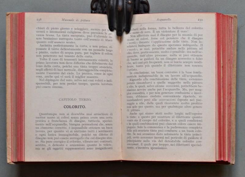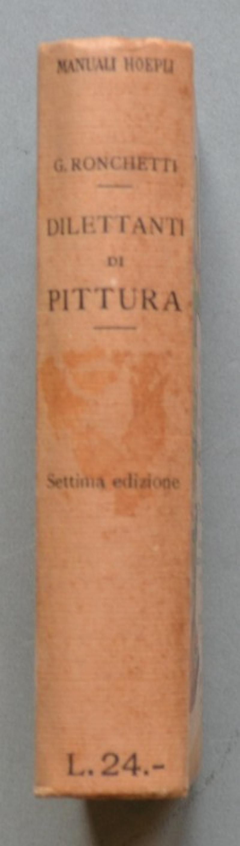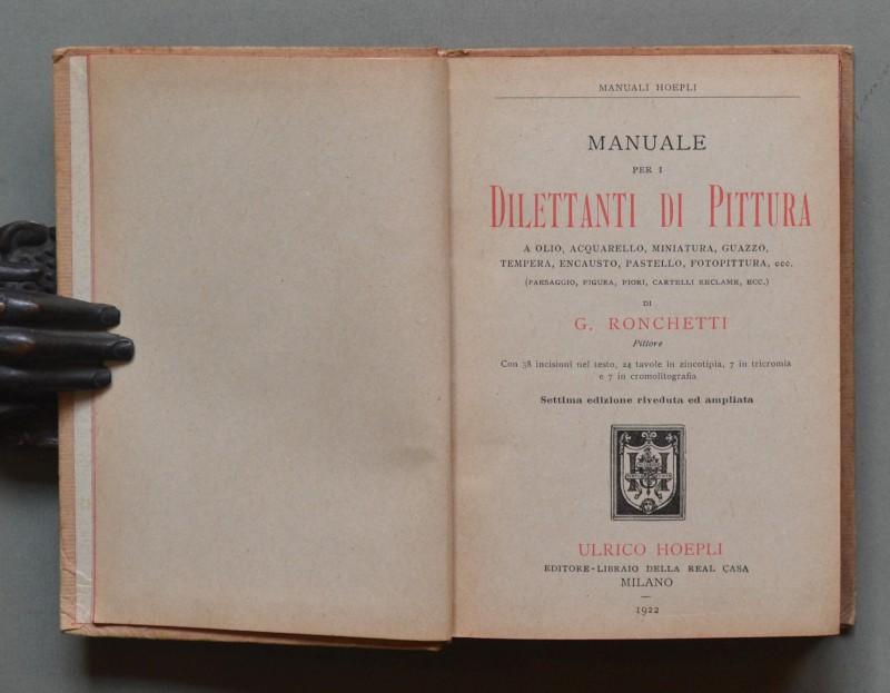 (Manuali Hoepli) RONCHETTI G..MANUALE PER I DILETTANTI DI PITURA. A olio, acquarello, miniatura, guazzo, tempera, encausto, pastello, fotopittura, ecc.. Settima edizione. Milano, Hoepli, 1922. In 16°, cartonatura editoriale illustrata, pp. XXIV + 475 con 38 incisioni nel testo, 24 tavole in zincotipia, 7 in tricromia e 7 in cromolitografia. Qualche brunitura alla copertina, interno in ottima conservazione. (Rif.D3686 - 488/67)