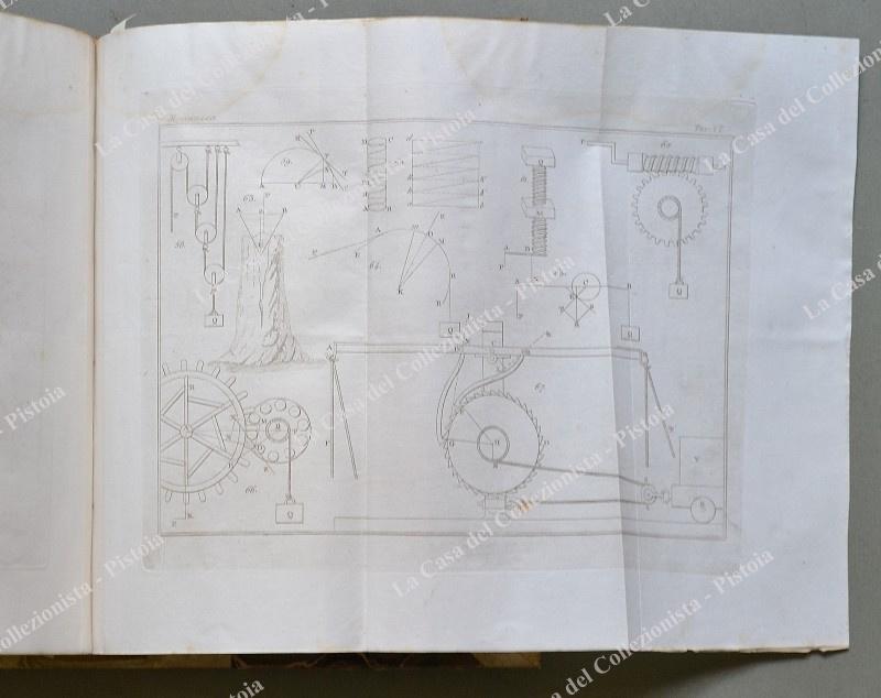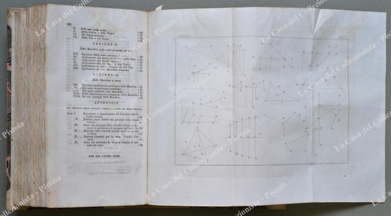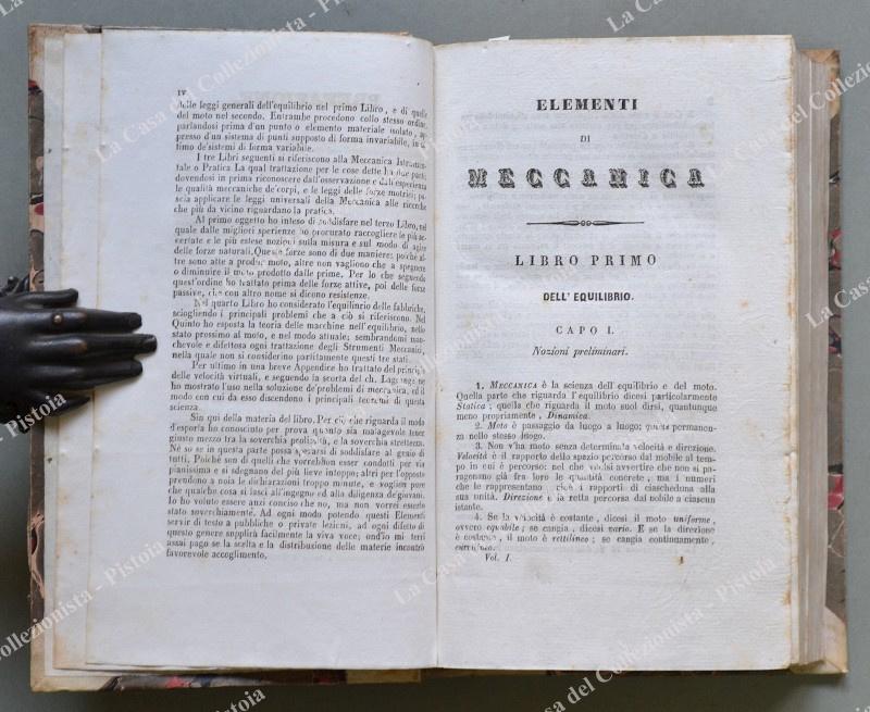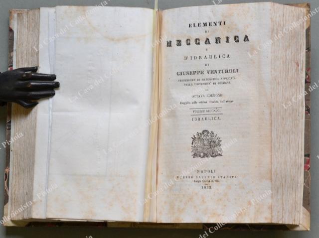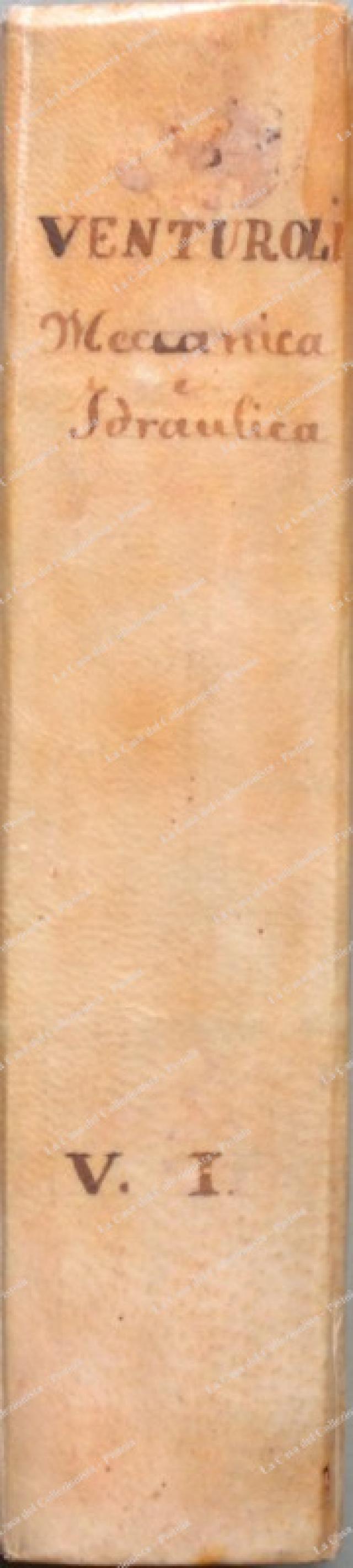 (Meccanica – Idraulica – figurato ‘800) VENTUROLI GIUSEPPE. ELEMENTI DI MECCANICA E D’IDRAULICA. Napoli, Saverio Starita, 1852. Due volumi in 8° (cm 12,5x21) di pp. IV + 300 con fuori testo 7 tavole ripiegate (dedicato alla meccanica) e pp. IV + 281 + (1) con fuori testo 7 tavole ripiegate (dedicato all’idraulica). Unica legatura in mezza pergamena coeva con titolo manoscritto al dorso. Ottima conservazione eccetto lievi ingiallimenti. (Rif.D5224 - 535/69)