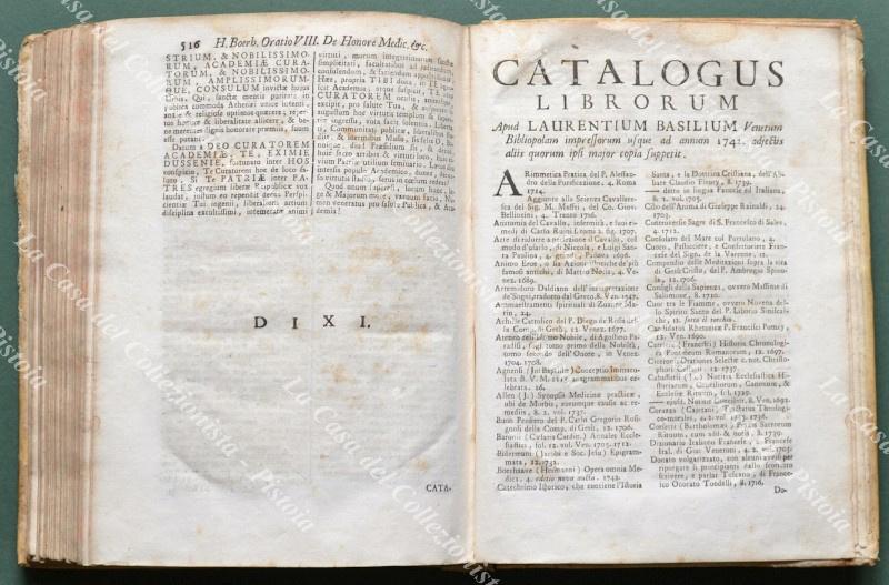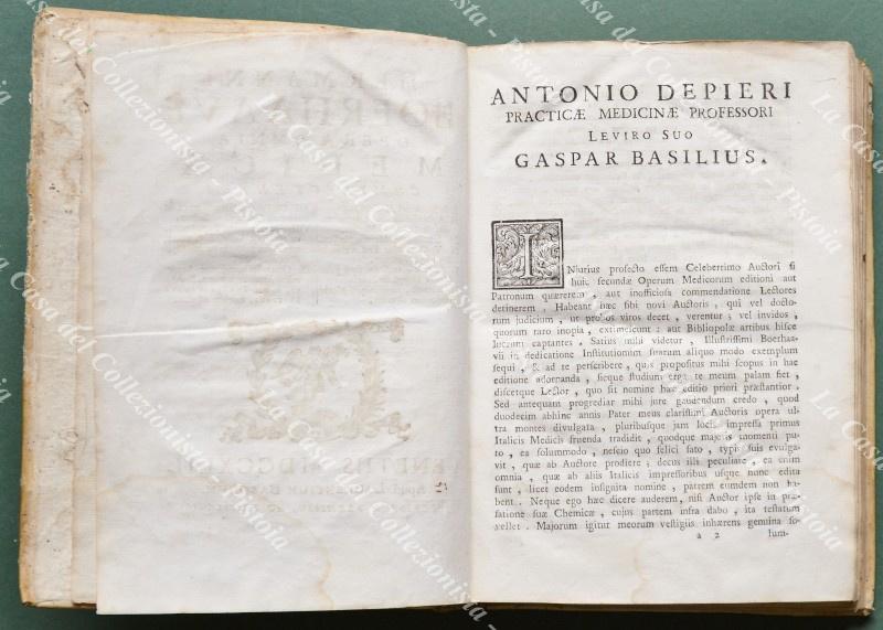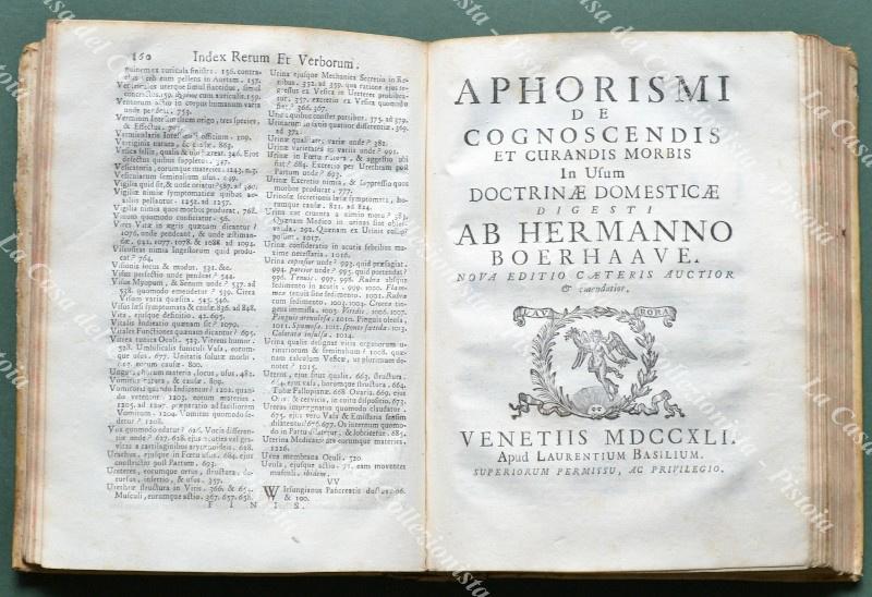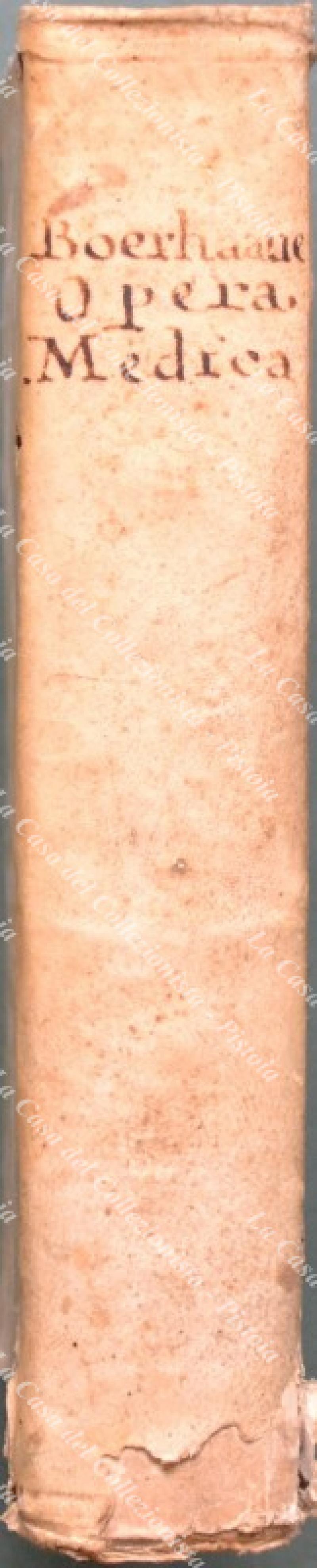 (Medicina - ediz. ‘700) BOOERHAVE HERMAN. OPERA OMNIA MEDICA. Venezia, presso Lorenzo Basilio, 1742. Cm 17x23.7, legatura coeva in piena pergamena con tit. manoscritti al dorso. Pp. (16) + 316 + (4) di catalogo dello sampatore. Terza edizione stampata a Venezia (la prima è del 1722) di questa raccolta di opere mediche del celebre medico olandese considerato il fondatore dell’insegnamento clinico e del moderno ospedale. Suddivisa in nove parti: 1) Institutiones Medicas. 2) Apho80 rismos de comioscendis, curandis morbis. 3) Libellum de Materia medica. 4) Tractatum de lue Aphrodisiaca. 5) Atrocis nec descripti prius morbi historiam. 6) Atrocis, rarissimique morbi Historiam altera. 7) De fabrica glandularum... epistolam. 8) De Mercurio experimenta... 9) Orationes inaugurales academicas. Volume solido, mende alla pergamena nella parte inferiore del dorso e al labbro del piatto anteriore, interno con pochi lievi aloni e leggeri ingiallimenti. (Rif.F1056-401/74)
