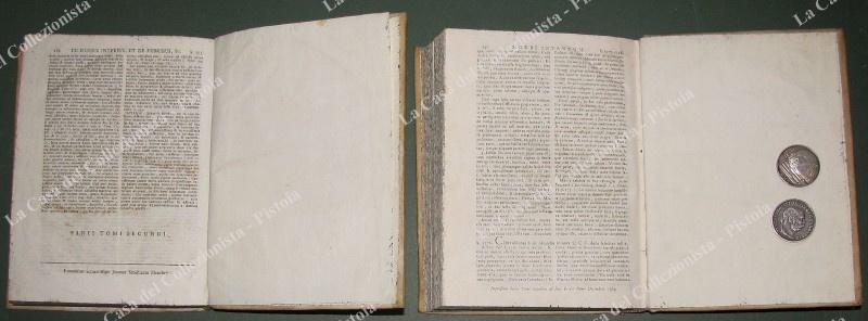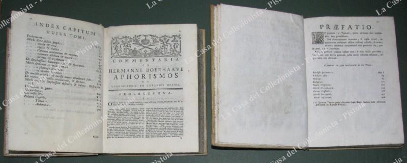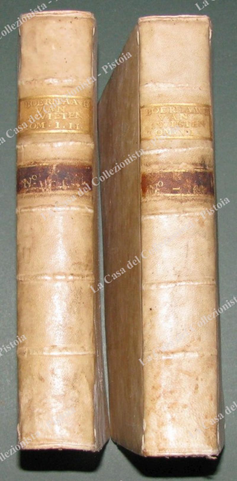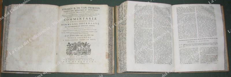 (Medicina – ediz. ‘700) GERARDI B. DE VAN – SWIETEN. COMMENTARIA IN OMNES APHORISMOS HERMANNI BOERHAAVE DE COGNOSCENDIS ET CURANDIS MORBIS. Editio postrema veneta… Bassano, Remondini, (poi) Venezia G.B. Pasquali, 1770-1778. Opera omnia in 7 tomi (1379 paragrafi). Disponiamo dei I° e II° in unico volume (dal paragrafo 1 al 593) stampati da Remondini a Bassano nel 1770 di pp. 314 con frontespizio in rosso e nero e pp. 284. Disponiamo ed uniamo anche del tomo VI° di precedente edizione stampato a Venezia da G.B. Pasquali nel 1764, di pp. 548 con antiporta incisa contenente i paragrafi 1196-1378. Legature uniformi in piena pergamena settecentesca con nervi e tassello al dorso. In ciascun tomo la trattazione dei vari argomenti è completa. Nei primi 2 tomi: ferite al capo, al torace, all’addome, convulsioni emorragie, contusioni, fratture, ascessi, cancrena, cancro, malattie delle ossa, febbri in genere, ecc.. Nel VI° tomo: tisi polmonare, malattie delle vergini, donne gravide, dei bambini, ecc.. Swieten, allievo di Boerave è fra i fondatori della medicina clinica, fu dal 1745 medico di corte di Maria Teresa d’Austria; su suo incarico si recò in Moravia per valutare il fenomeno del vampirismo definendola come pura superstizione. (Rif.D8039-491/72)