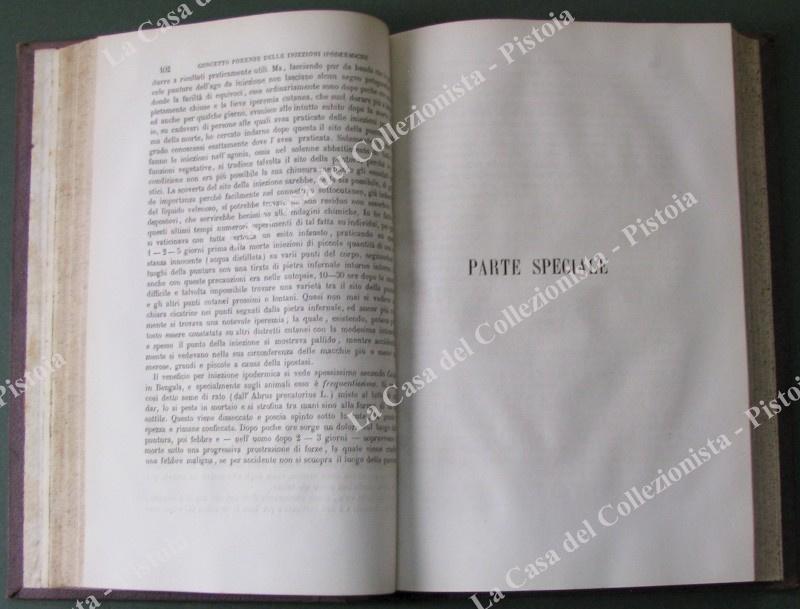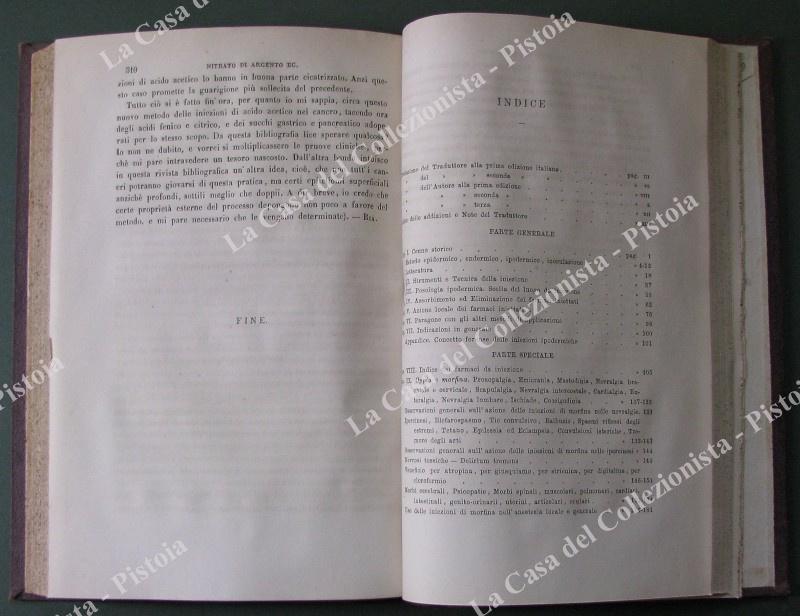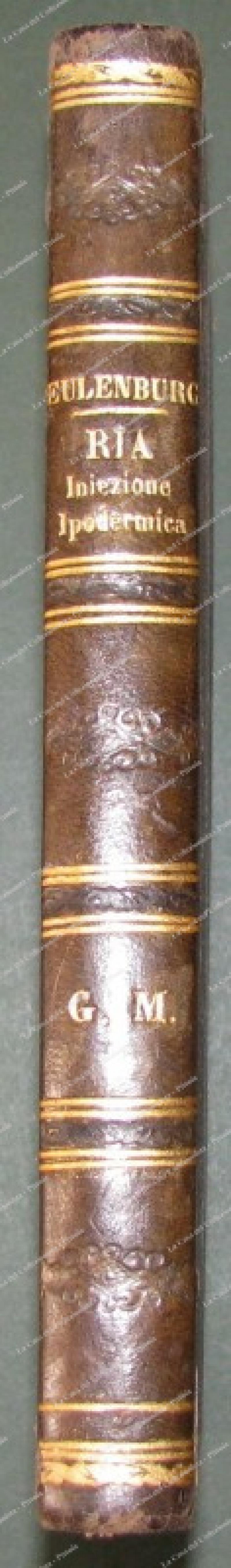 Medicina. EULENBURG ALBERT. "LA INIEZIONE IPODERMICA DEI FARMACI. Opera elaborata secondo esperimenti fisiologici ed osservazioni cliniche. Con addizioni e note del prof. Giuseppe Ria". UNITO. LEVISTEIN EDUARD. "LA MANIA MORFINICA. Monografia. Tradotta sulla seconda ediz. tedesca". (1880). Napoli, St. Tip. dell'Ancona, 1882. Cm15x22,5, bella mezza pelle coeva con al dorso fregi e titoli in oro. Pagine XIV + (2) + 312 + 63 + (1). Ottima conservazione. (Rif.E3376)