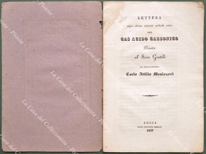Medicina. Menicucci Carlo Attilio. LETTERA SOPRA ALCUNE EMINENTI MEDICHE VIRTU' DEL GAS ACIDO CARBONICO. Lucca, Tip. Benedini, 1837. In 8° (cm 14x31), brossura originale tipografica, pagine 16. Minime usure e macchietta alle pagine. (Rif.D9168)