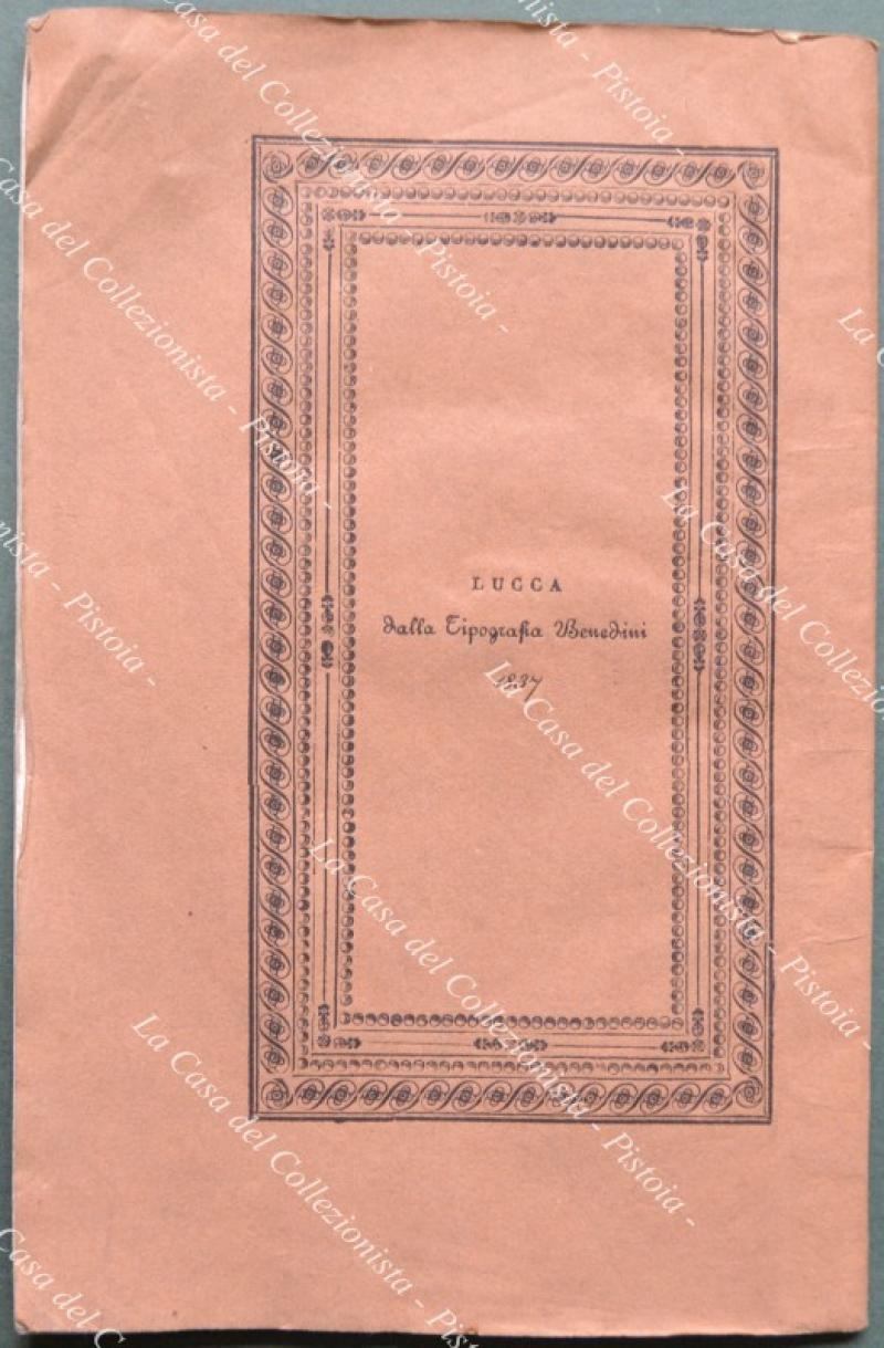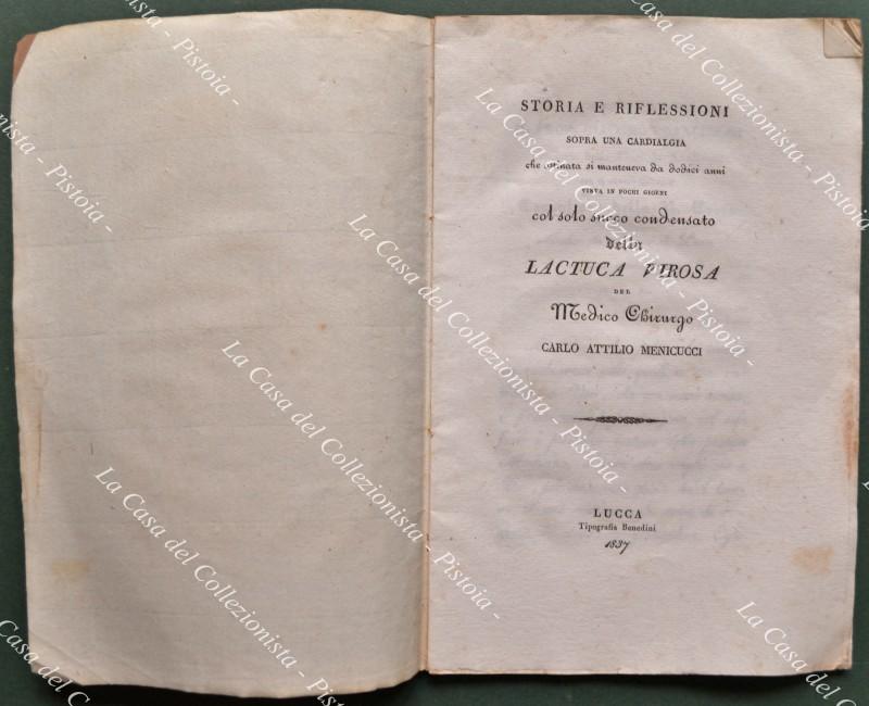 Medicina. Menicucci Carlo Alberto. STORIA E RIFLESSIONI SOPRA UNA CARDIALGIA CHE OSTINATA SI MANTENEVA DA DODICI ANNI VINTA IN POCHI GIORNI COL SOLO SUCCO CONDENSATO DELLA LACTUCA VIROSA. Lucca, Tip. Benedini, 1837. In 8° (cm 14x21), brossura editoriale tipografica, pagine 37 + (3). Dedica dell'autore al piatto anteriore. Prima edizione. Ottima conservazione. (Rif.D9167)