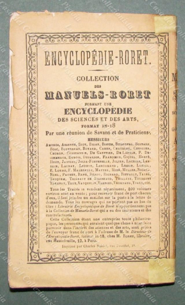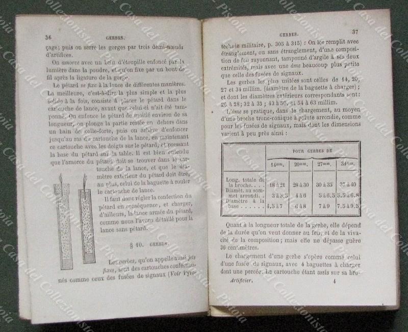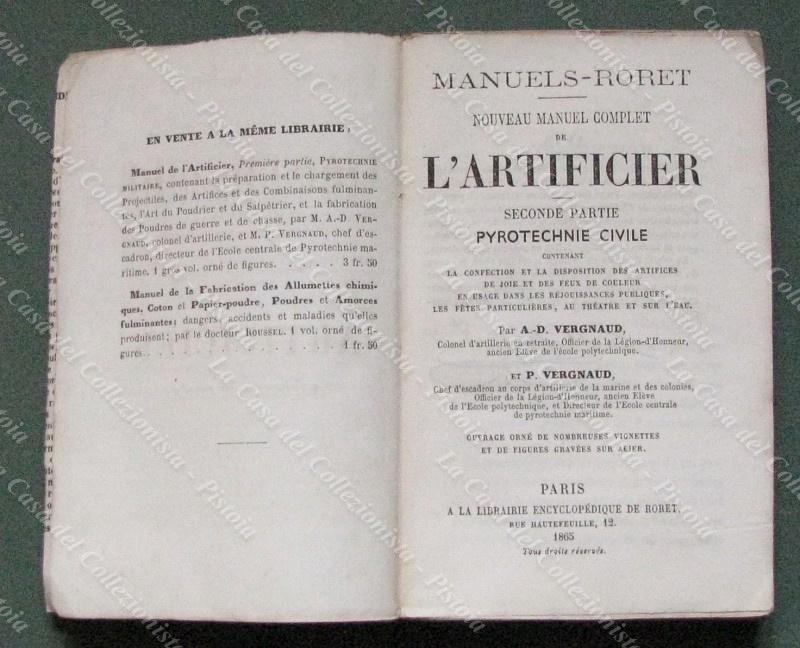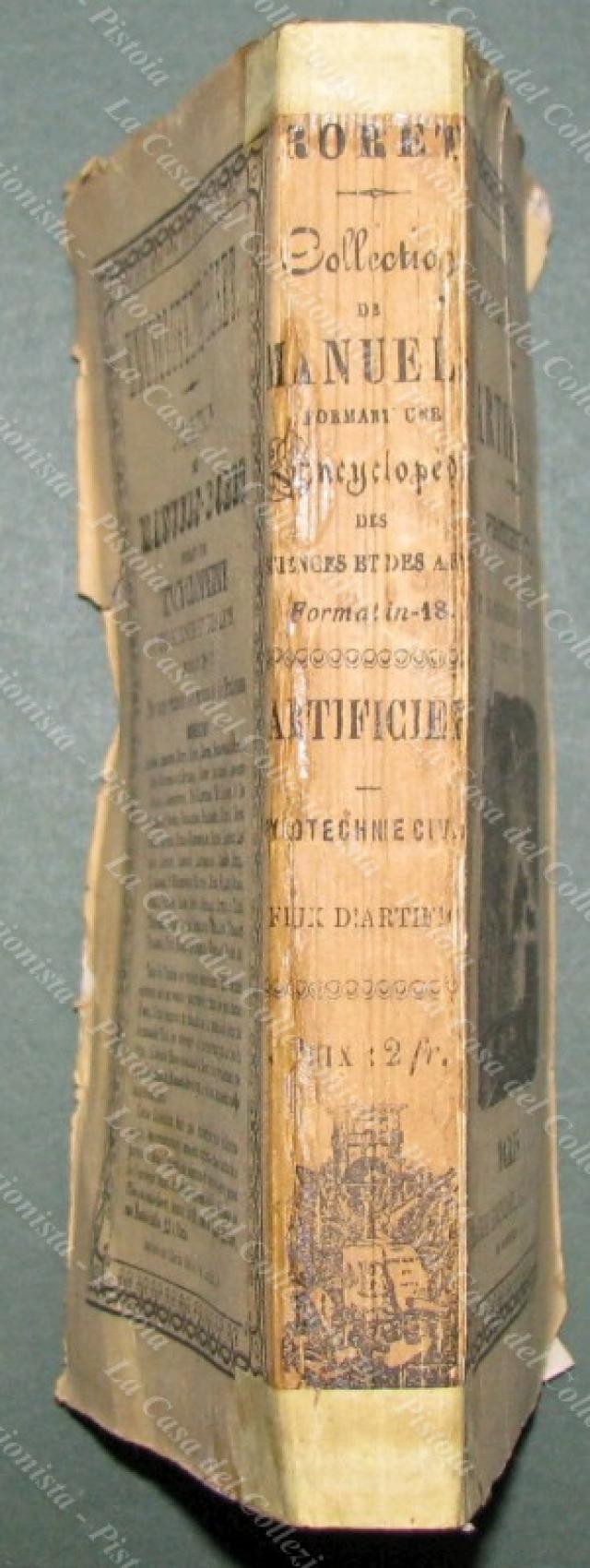 Pirotecnia. VERGNAUD A.D.- VERGNAUD P.. "NOUVEAU MANUEL COMPLET DE L'ARTIFICIER. Secondie partie. PYROTECHNIE CIVILE. Contenant la confection et la desposition des artifices de joie et des feux de couleur en usage dans les réjoussances publiques, les fétes particulieres, au théatre et sur l'eau". Parigi, Librairie Eneyclopedique De Roret, 1865. Cm 9,5x15, brossura editoriale, pagine VII + 198 con fuori testo una tavola ripiegata con varie figure incise su acciaio. Lievi mende alla brossura, buona conservazione. (Rif.E5878)
