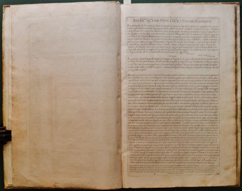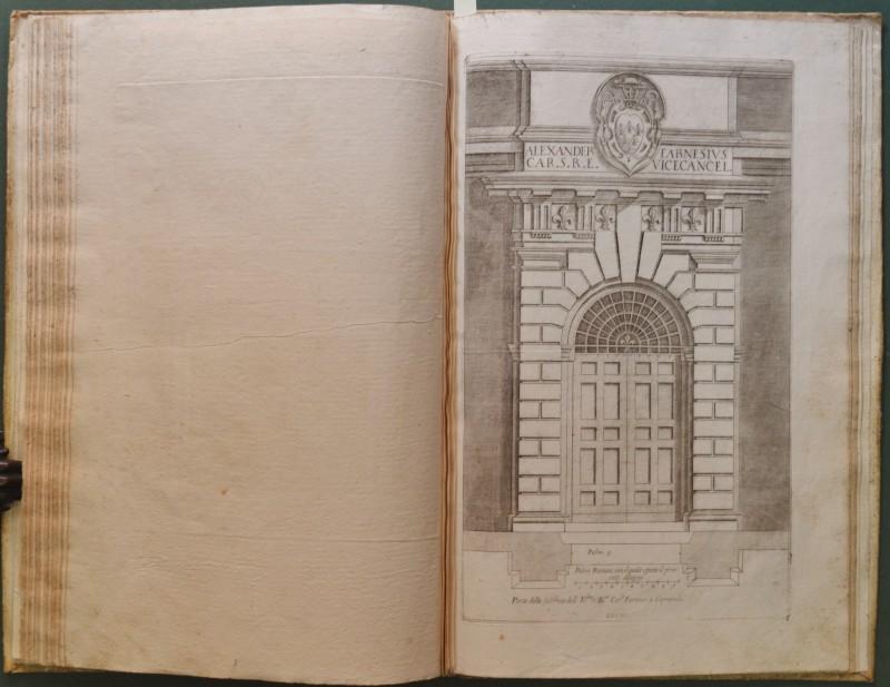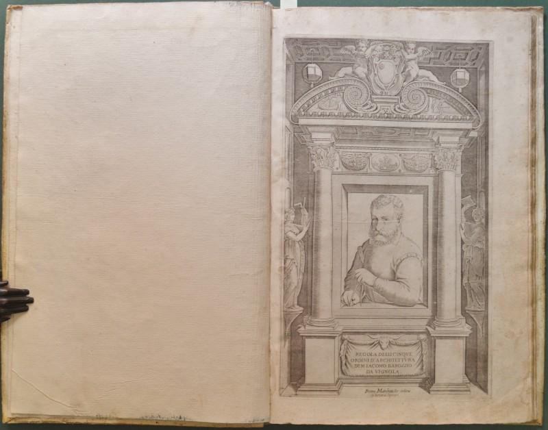 (Architettura - edizione illustrata ‘600) BAROZZI GIACOMO DA VIGNOLA. REGOLA DELLI CINQUE ORDINI DI ARCHITETTURA DI M. IACOMO BAROZZIO DA VIGNOLA. Siena, Pietro Marchetti, senza data (ma 1635). In folio (cm 26x40.6), legatura coeva in piena pergamena. 45 tavole numerate incise in rame (compresi i due frontespizi e le tavole con dedica a Volunio Bandinelli). La prima parte con tiene 37 tavole relative ai cinque ordini, alle porte e a un camino; la seconda parte, con frontespizio dal titolo “Nuova et ultima aggiunta delle porte d’architettura di Michel Angelo Buonarrotti Fiorentino Pittore Scultore et Architetto Eccell.mo”, contiene 7 tavole dedicate alle porte disegnate da Michelangelo. Legatura in buona conserva zione con piccoli restauri professionali al dorso; interno buono con solamente lievi bruniture e sporadici aloncini. (Rif.F5670-437/76)