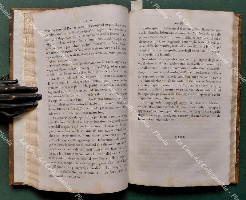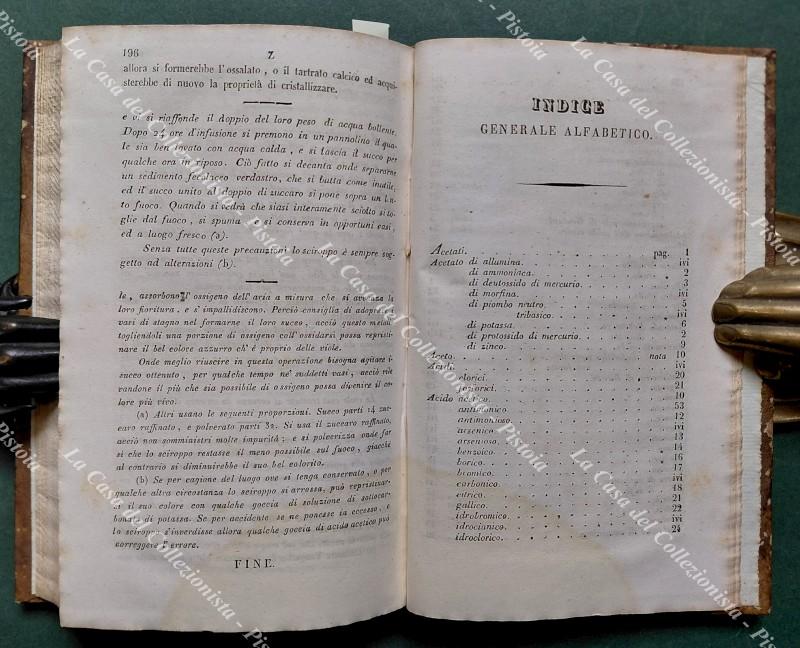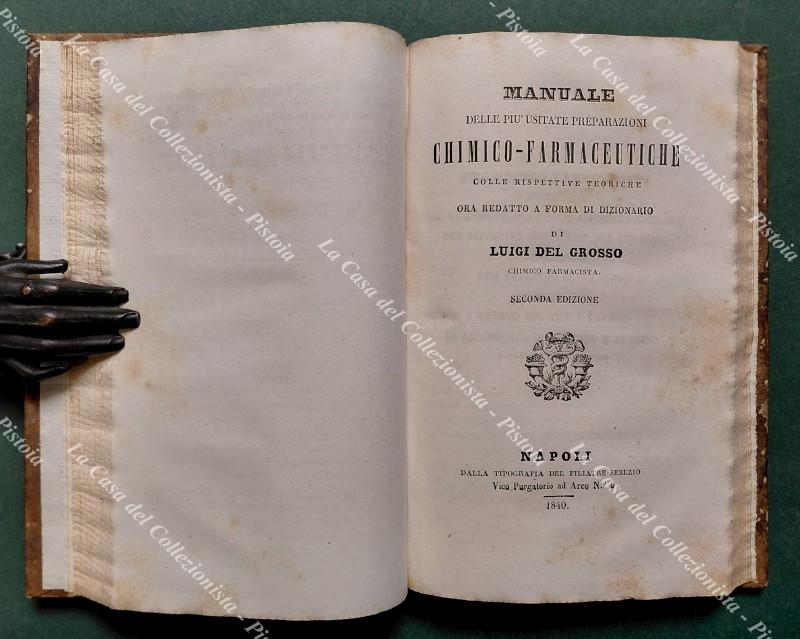(Chimica) NAPOLI Raffaele. SAGGIO DI FILOSOFIA CHIMICA. Napoli, Tip. Del Tasso, 1843. Cm 12,5x19,5, elegante legatura coeva in piena pelle con tassello e fregi in oro al dorso. Pp. 122. UNITO. DEL GROSSO Luigi. MANUALE DELLE PIU' USITATE PREPARAZIONI CHIMICO - FARMACEUTICHE. Colle rispettive teoriche ora redatto a forma di dizionario. Napoli, Tip. Del Filiatre-Sebezio, 1840. pp. 208. Legatura solida e ben conservata con minime usure, interno buono. (Rif.F7078)