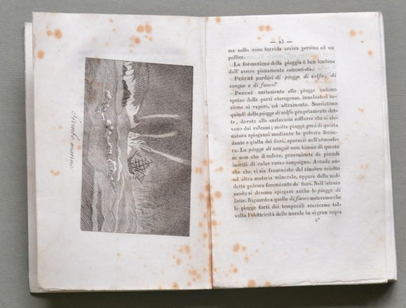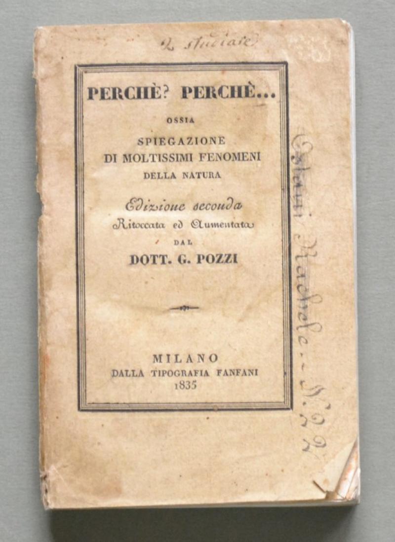(Scienza) POZZI G.. PERCHE’? PERCHE? Ossia spiegazione di moltissimi fenomeni della natura. Edizione seconda ritoccato ed aumentata. Milano, Fanfani, 1835. In 24° (cm 9x14), brossura originale tipografica. Pagine V + 177 con antiporta allegorica e 2 tavole fuori testo raffigurante una cascata e un’eruzione vulcanica. Qualche usura e difetti al dorso. (Rif.D3583 - 454/67)