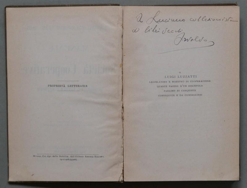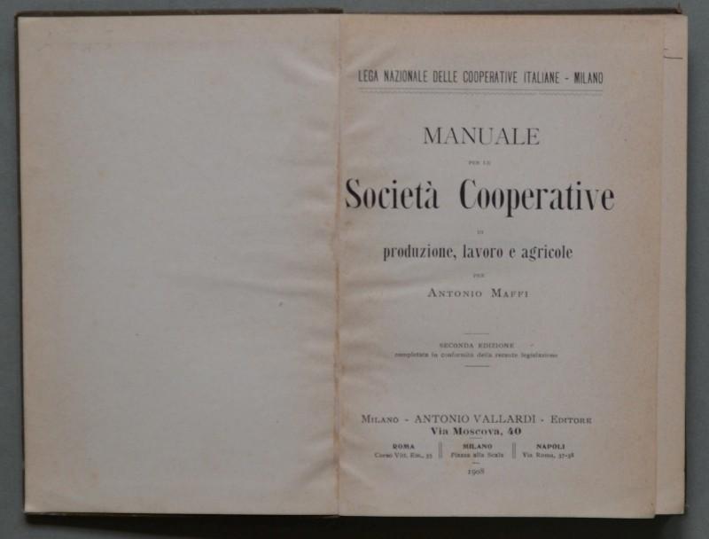 (Società Cooperative) MAFFI ANTONIO. MANUALE PER LE SOCIETA’ COOPERATIVE DI PRODUZIONE, LAVORO E AGRICOLE. Milano, Vallardi, 1908.