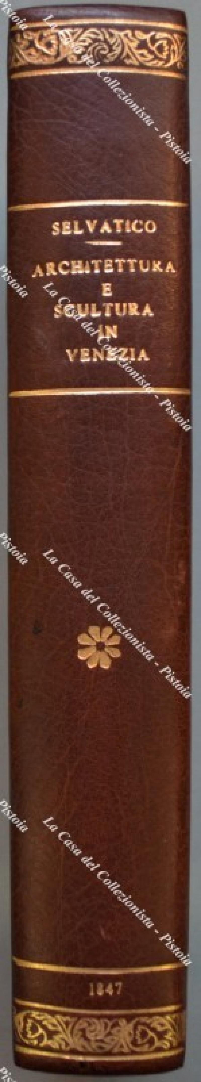 (Architettura - Venezia) SELVATICO PIETRO. SULLA ARCHITETTURA E SULLA SCULTURA IN VENEZIA DAL MEDIOEVO FINO AI NOSTRI GIORNI. Studi per servire da Guida estetica. Con 70 vignette in legno ed una tavola in rame. Venezia, Paolo Ripamonti Carpano, 1847. Cm 16x24, bella mezza pelle recente con al dorso fregi e titolo in oro. Pp. XXIII + 529 con 10 tavole fuori testo. Prima edizione. Opera completa. Volume solido, legatura ottima; interno con difetti: bruniture leggere ma diffuse, frontespizio un poco sporco e con piccoli danni, ultime quattro pagine (dell'indice) con mancanze reintegrate e in cattiva condizione. (Rif.F5993-76)