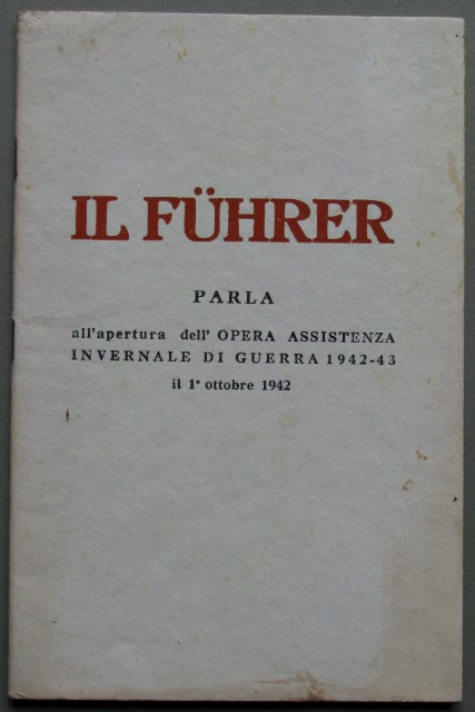 (Nazismo). Il FUHRER parla all'apertura dell'Opera Assistenza Invernale di Guerra 1942-43 il 1'° ottobre 1942. Roma, Tip. Failli, 1942. In 8'° (cm 13,5x20,5), brossura editoriale, pagine 32. Conservazione buona eccetto diffusi ingiallimenti. (Rif.B9913)