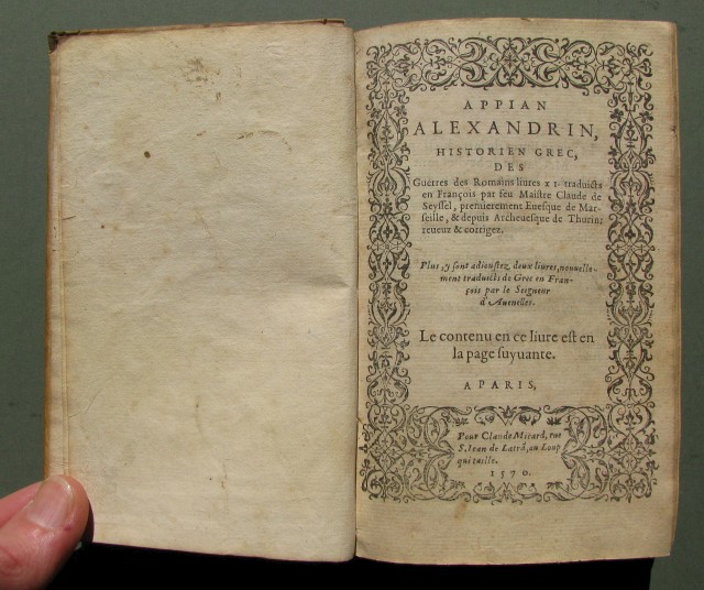 (Storia - Edizione '500) APPIANO ALESSANDRINO. "Appian Alexandrin, Historien Grec, des Guerres des Romains liures XI. Traduicts en Francois par seu Maistre Claude de Seyffel, premierement Eusque de Marseille, & depuis Archeuesque de Thurin: reveuz & corrigez". Parigi, Claude Micard, 1570. In 16° (mm 96x155), piena pergamena settecentesca con titolo manoscritto al dorso (piccola lacuna alla pergamena). Carte 20 non numerate + 496 numerate. Rara edizione. Ottima conservazione. (Rif.B9090-599/70)