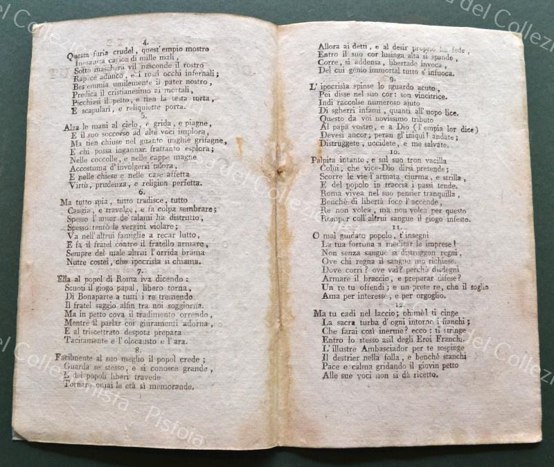 (Dominazione francese - poesia) LANCETTI VINCENZO. LA MOERTE DEL GENERALE DUPHAUT. CANTO DEL CITTADINO L.V.. Milano, Dalla Stamperia Italiana e Francese a S. Zeno, s.d. (ma 1798). In 16° (12x19,5), brossura muta originale, pagine 8. Qualche ingiallimento. Buona conservazione. L'assassinio del Generale Duphaut avvenuto a Roma il 28 dicemnbre 1797 rappresentò per i francesi il "Casus Belli" per invadere lo Stato Pontifico e per la costituzione della Repubblica Romana. (Rif.F4182)