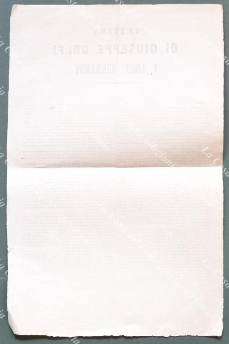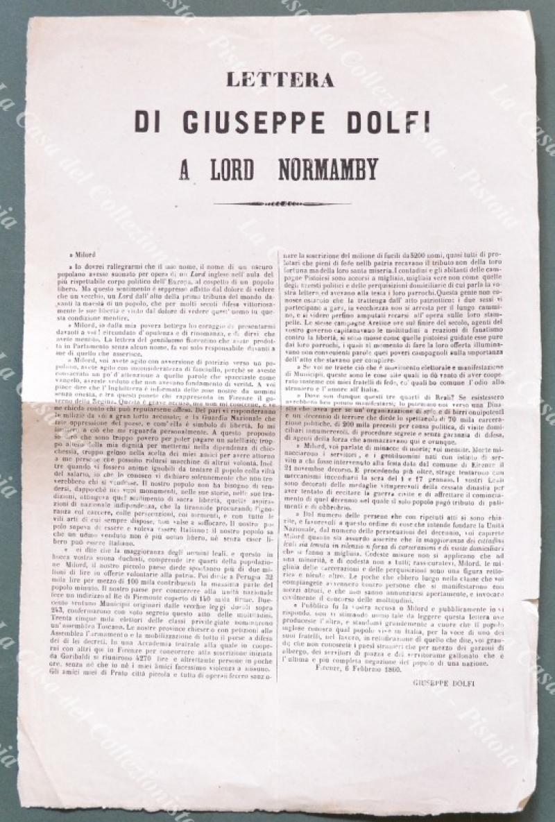 FOGLIO VOLANTE-RISORGIMENTO. "LETTERA DI GIUSEPPE DOLFI A LORD NORMAMBY". Nel testo Giuseppe Dolfi (Firenze 1818-Firenze 1869, patriota e massone italiano) replica a Lord Normamby accusandolo di mentire quando afferma che i due terzi dei toscani erano contrari all'annessione al regno di V. Emanuele. Fogli di cm 23x36 stampato in Firenze, 6 febbraio 1860. Ottima conservazione. (Rif.F1231)