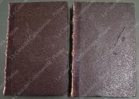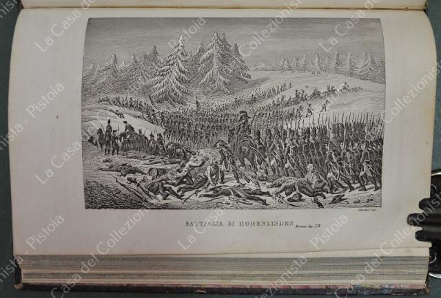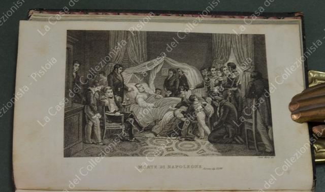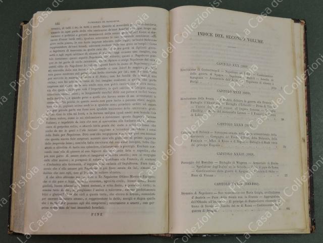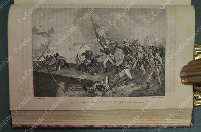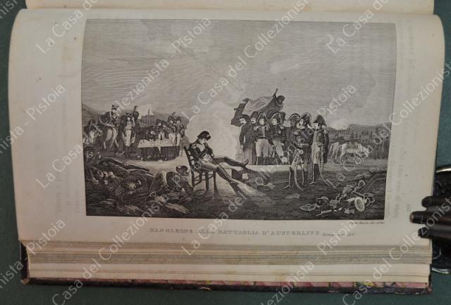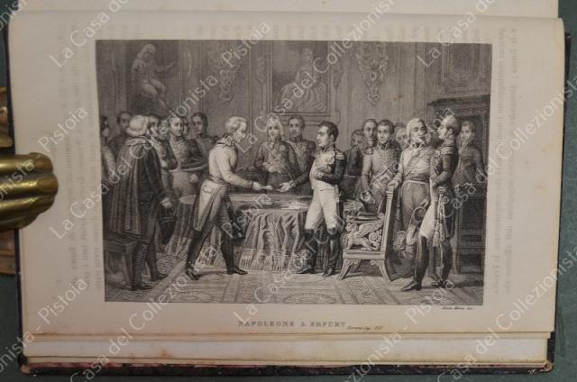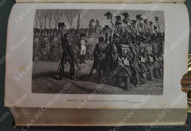 (Napoleone - illus. 1800) DE NORVINS J.. STORIA DI NAPOLEONE E DEL GRAN'ESERCITO. Milano, Pagnoni senza data (circa 1850). Cm 13,5x21, legature coeve in mezza pelle con al dorso nervi e titoli in oro. Due volumi di pagine II + 376 e pagine II + 446 + (2). Frontespizi figurati a ciascun volume, due ritratti all'antiporta e fuori testo 57 tavole incise su rame (fra cui 4 fac - simili ripiegati). Al nostro esemplare mancano all'origine la tavola 5 (Bonaparte visita gli appestati) del primo volume e la tavola 8 (morte di Lannes) del secondo volume; in più perchè doppia, la tavola del secondo volume (ritratto di M. Luigia). Volumi solidi, legature ben conservate eccetto minime usure, lievi ingiallimenti alla carta delle pagine e minime mende. (Rif.F7859)