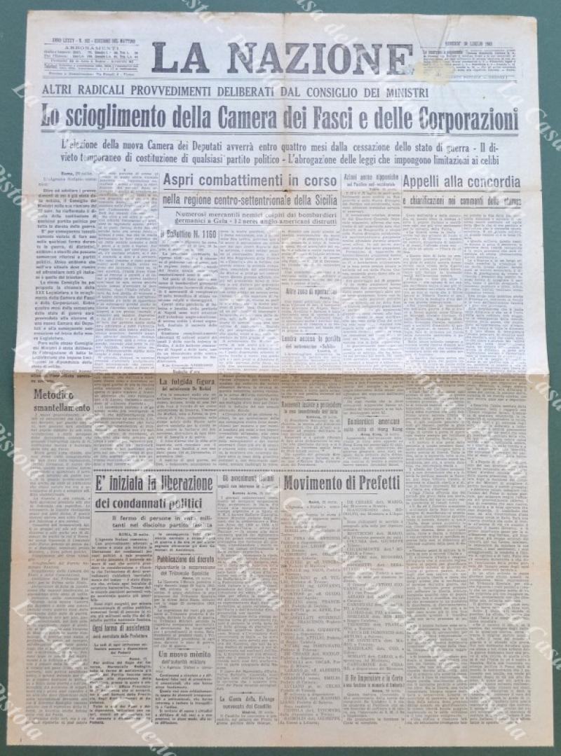 REPUBBLICA SOCIALE ITALIANA. LO SCIOGLIMENTO DELLA CAMERA DEI FASCI E DELLE CORPORAZIONI. La Nazione, 30 luglio 1943. Solo I° e II° pagina, in folio. (Rif.F1176-617/74)