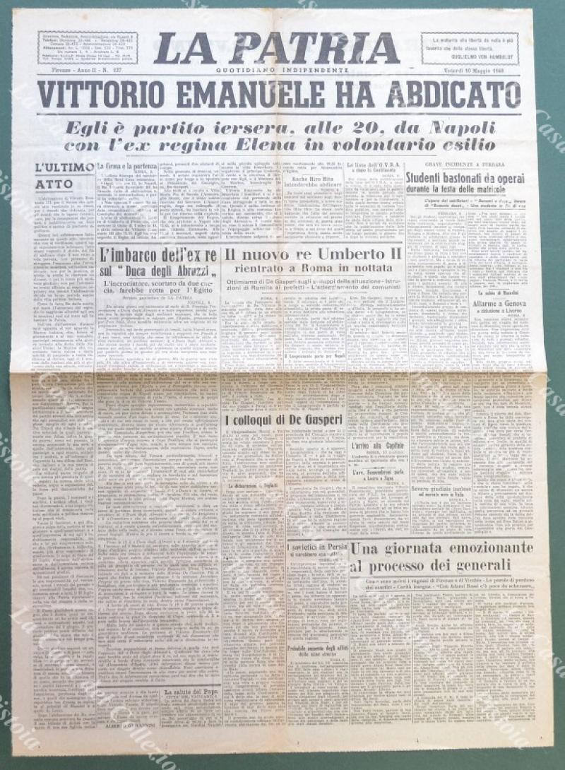 REPUBBLICA SOCIALE ITALIANA. VITTORIO EMANUELE HA ABDICATO. La Patria, 10 maggio 1946. Solo I° e II° pagina, in folio. Minimi difetti. (Rif.F1168-634/74)