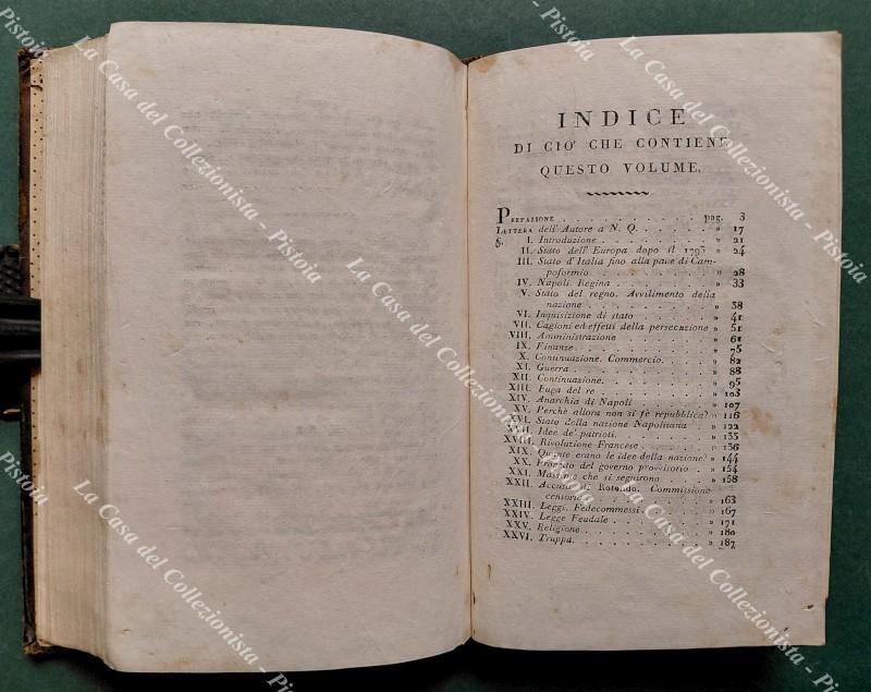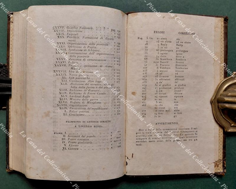 (Napoli, rivoluzione del 1799) CUOCO Vincenzo. SAGGIO STORICO SULLA RIVOLUZIONE DI NAPOLI. Seconda edizione con aggiunte dell'autore. Milano, Tip di Francesco Sonzogno, 1806. Cm 12x20, legatura coeva in piena pelle. Pagine 305 + LXIX + 5 non numerate con indice e correzioni. Ingiallimenti diffusi, marginali segnetti di tarlo alle ultime due carte e al contropiatto, legatura solida con qualche usura e tassello al dorso in parte mancante. (Rif.F7077)
