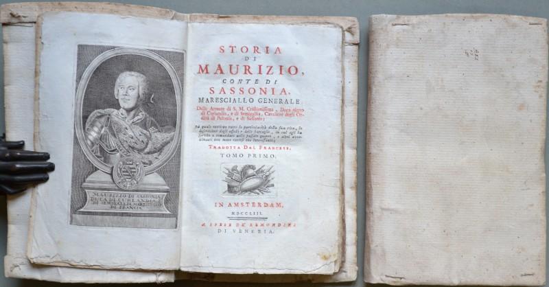 (Storia – ediz. ‘700) NEEL LOUIS BALTHASAR. STORIA DI MAURIZIO, CONTE DI SASSONIA, MARESCIALLO GENERALE... … La quale contiene tutte le particolarità della sua Vita, le descrizioni degli assedi e delle battaglie, in cui egli ha servito e comandato nelle passate guerre, e altri avvenimenti non meno curiosi che interessanti. Amsterdam (ma Venezia), Remondini, 1753. In 16° (cm 12,5x19,5), cartonatura alla rustica coeva, esemplare in barbe. Due volumi: 1) Ritratto inciso in rame di Maurizio di Sassonia all’antiporta, pagine XII + 2 non numerate + 274, frontespizio in rosso e nero, alcuni capilettera, finalini e vignette nel testo. 2) Pagine 4 non numerate + pagine 236, testatine e capilettera incisi. Dorso del primo volume restaurato, pagine bianche di guardia sostituite. Buona conservazione, qualche ingiallimento. (Rif.D4529 - 590/68)