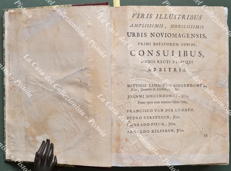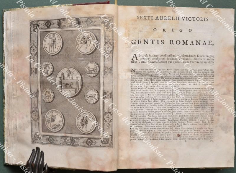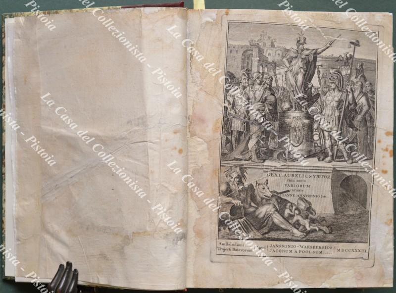 (Storia romana - ediz. '700) AURELIUS VICTOR. HISTORIA ROMANA, CUM NOTIS INTEGRIS DOMINICI MACHANEI, ELIAE VINETI, ANDREAE SCHOTTI, JANI GRUTERI, NEC NON EXCERPTIS FRID. SYLBURGII & ANNAE FABRI Filiae. Amsterdam e Utrecht, Janssonius van Waesberge e J. van Poolsum, 1733. Cm 18,5x24,5, bella legatura moderna in mezza pelle con titolo in oro al dorso e piatti marmorizzati. Antiporta inciso in rame + pp. (44) + seconda antiporta incisa in rame + pp. 668 + pp. (132) di indice. Esemplare completo ma da studio; il volume è solido, è stato alluvionato e reca vari danni (senza perdite di testo) e macchie di muffa restaurati per il possibile; varie incisioni nel testo raffiguranti monete. (Rif.F0631)