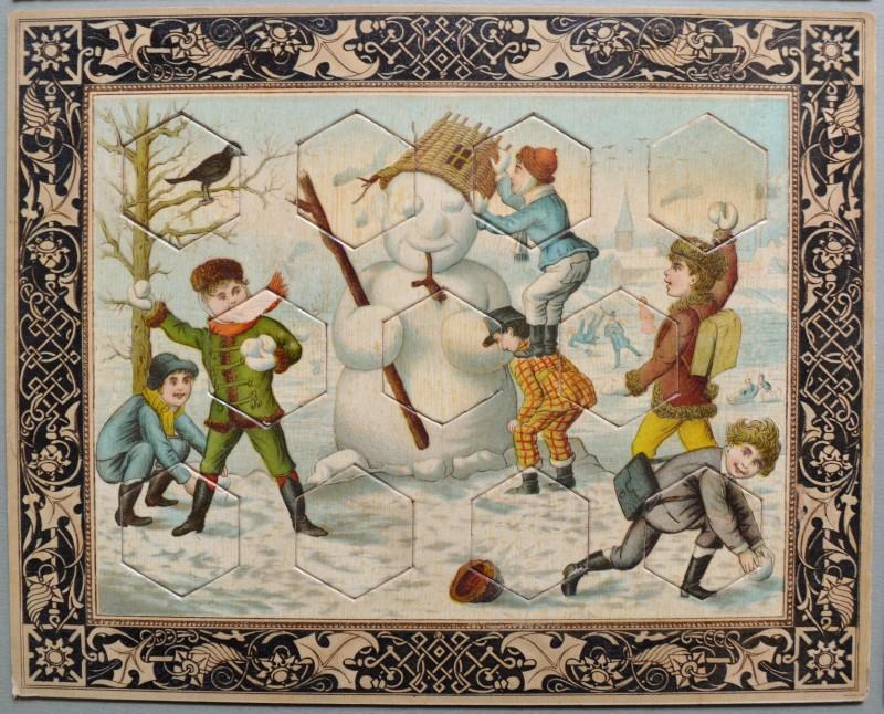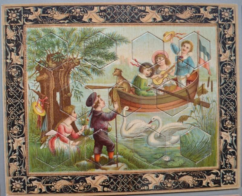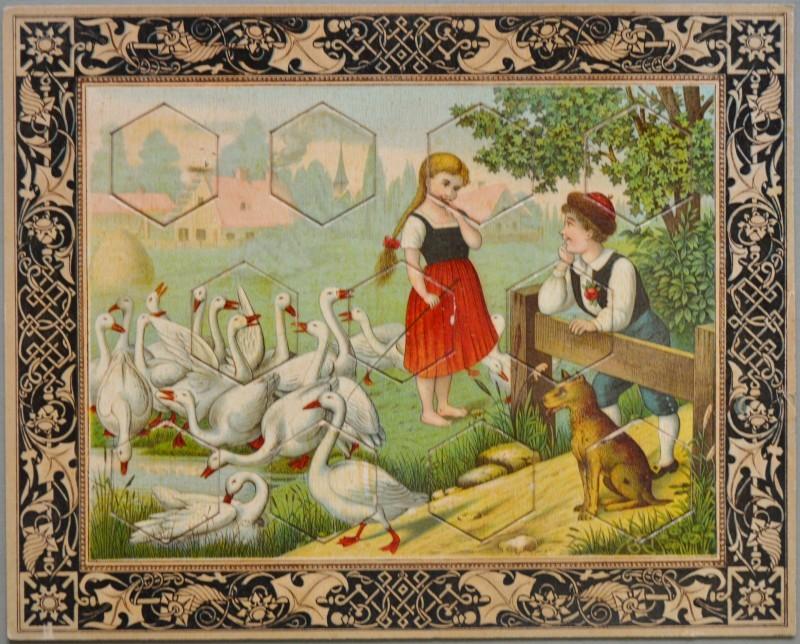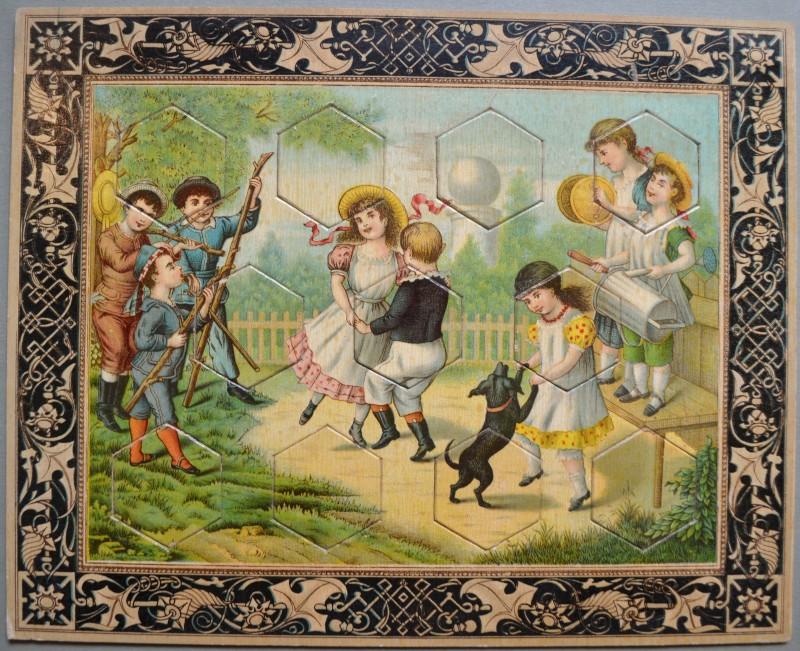 Giochi, giocattoli. 5 PUZZLE D'EPOCA. Ciascuno di cm 25x20, databili alla seconda metà dell'800. Belle litografie a colori con scene di bimbi che giocano; in ciascuna vanno inserite 11 tessere. Conservazione ottima, minime impefezioni. Ne uniamo un altro a cui è caduta la figura di una tessera. (Rif.F5919-76)