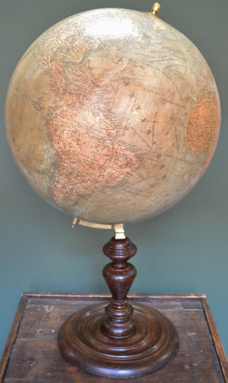 GLOBO TERRESTRE databile tra la fine dell’800 ed i primi anni del 1900. Realizzato in legno e gesso con applicata la cartografia su cui è presente il cartiglio del produttore “ERDGLOBUS 36 cent. Durchgesehen von Dr. Henry Lange. BERLIN. Ludw.Jul. Heymann.”. Montato su struttura di legno tornito. Altezza cm 60, diametro del globo cm 36. Globo raro ma presenta alcune mende (modeste mancanze di cartografia lungo due meridiani in corrispondenza dell’Europa e dell’Asia; disponibili ulteriori immagini a richiesta). Ottimo e suggestivo aspetto. (Rif.F1095-179/74)