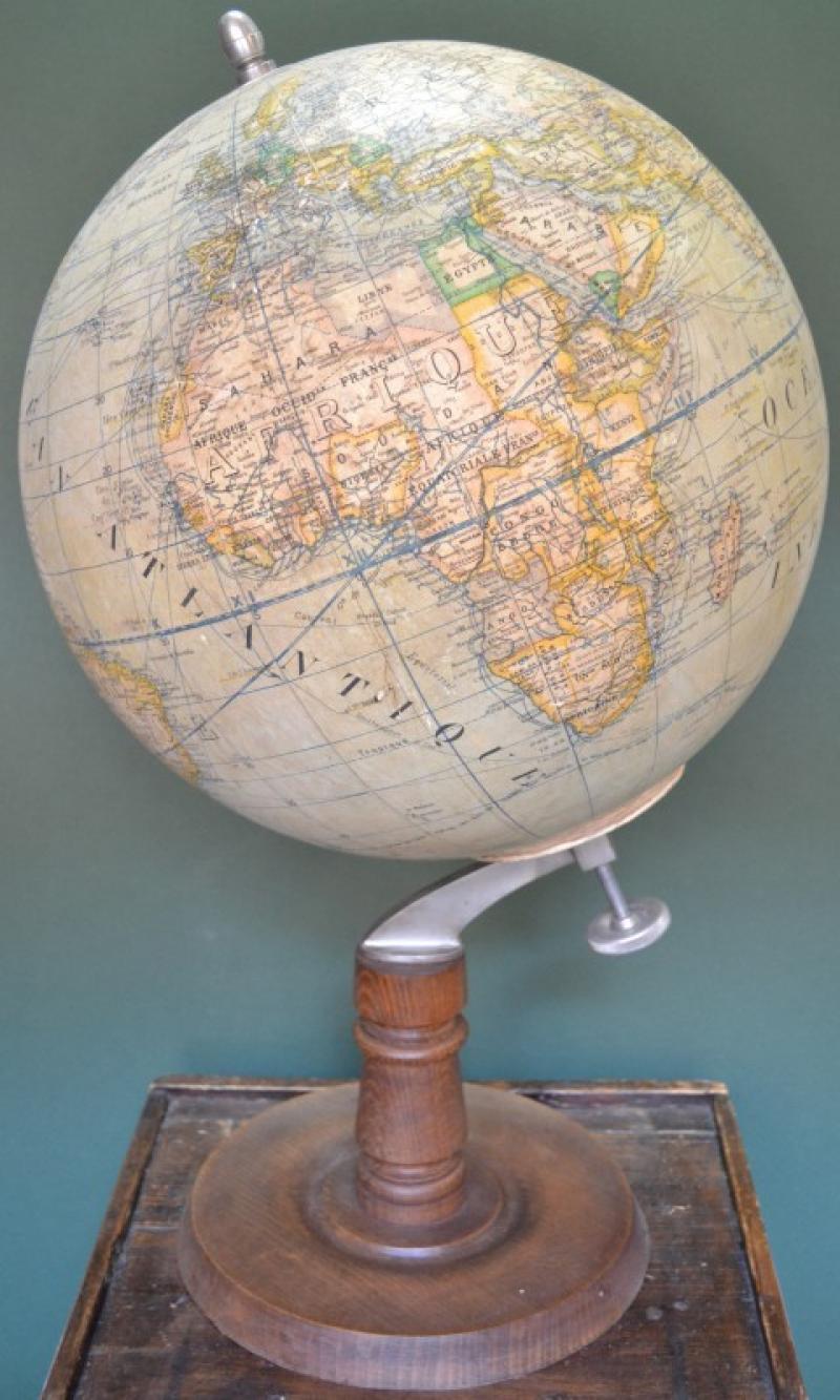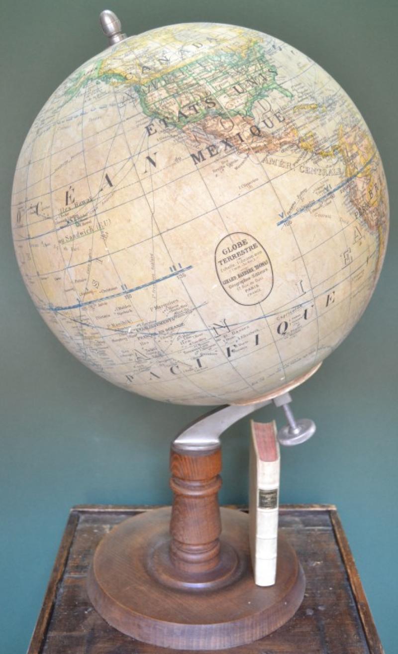 GLOBO TERRESTRE di importanti dimensioni edito da Girard, Barrére et Thomas negli anni cinquanta del ‘900. Oltre alla mappa territoriale sono riportate le correnti oceaniche e le principali rotte commerciali del periodo. Sfera in cartapesta e base in legno tornito. Altezza cm 72, diametro sfera cm 40. Lievi imperfezioni (disponibili ulteriori immagini a richiesta). Veramente bello e di notevole effetto