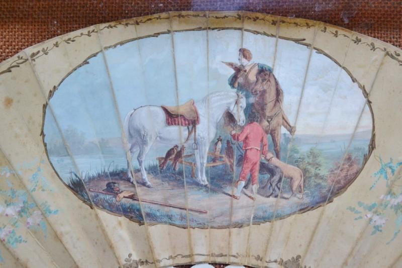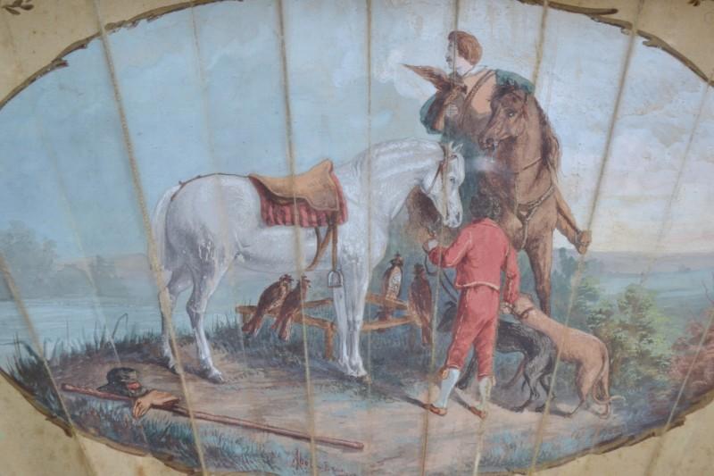 ABEL BRUN. VENTAGLIO databile alla fine dell'800. Pregevole scenetta realizzata a tempera e firmata raffigurante una scena di caccia con falcone. Stoffa, tempera e materiale di pregio.