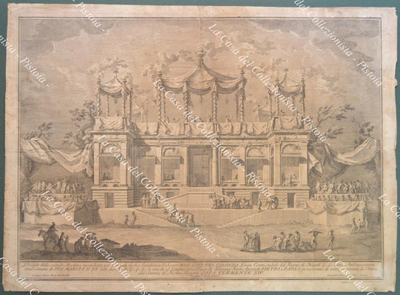 MACCHINE PIROTECNICHE. Ogni anno, d’estate, a Roma si celebrava la festa della Chinea con una lunga processione e celebrazioni che duravano due giorni; per due sere spari di macchine pirotecniche accompagnati da esecuzioni musicali, balli e rinfreschi. Disponiamo di due grandi rare stampe incise su rame da Giuseppe Vasi su disegno di Giuseppe Palazzi, purtroppo con alcuni difetti: 1) “Disegno della prima Machina rappresentante un Tempio dedicato alla Pace. Incendiata per commando di Sua Eccellenza il Signor Don Lorenzo Colonna…. Nella Vigilia della Festa dei GLORIOSI SANTI APOSTOLI PIETRO E PAOLO l’anno 1773”. Mm 528x378. Rifilata ai margini, un alone e lievi bruniture, tre pieghe verticali (la stampa era conservata ripiegata). 2) “Disegno della seconda Machina incendiata per comando di Sua Eccellenza il Signor Don Lorenzo Colonna…. la sera del 29 giugno 1770 Festa de’ Gloriosi Santi Apostoli PIETRO e PAOLO in occasione di aver presentata la Chinea alla Santità di Nostro Signore PAPA CLEMENTE XIV”. Mm 550x398 (ai margini 590x430). Un alone e qualche ossidazione, piegature verticali e orizzontali (la stampa era conservata ripiegata), apertura di circa 5 cm sulla base inferiore. (Rif.D9199-121/72)