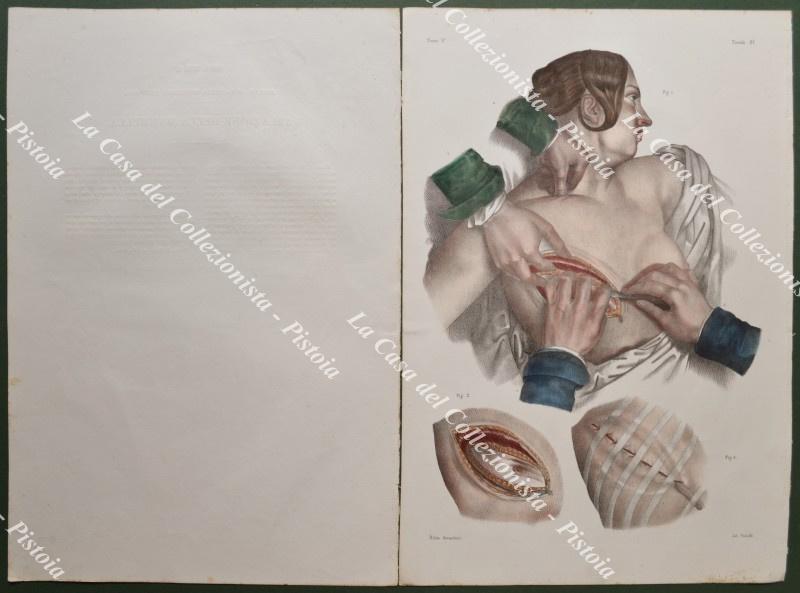 (Medicina, chirurgia) ABLAZIONE DELLA MAMMELLA.Grande tavola in litografia acquarellata all'epoca accompagnata da altra tavola descrittiva. Tratta dall'opera di Jean Baptiste Bourgery stampata in folio a Firenze tra il 1841 ed 1851.