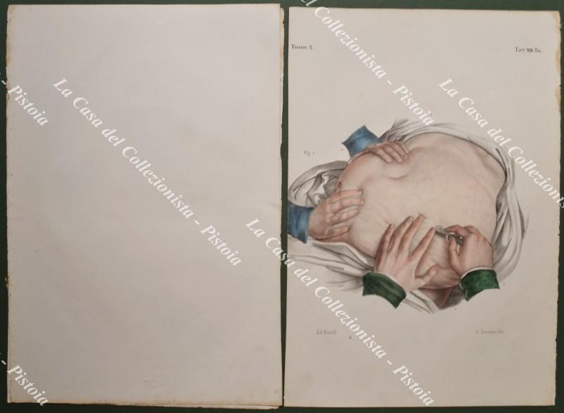 (Medicina, chirurgia) PUNZIONI DELL'IDROPERICARDIO, DELL'ASCITE E DEGLI ASCESSI DEL FEGATO. Due tavole in litografia acquarellate all'epoca accompagnate da altra tavola descrittiva. Firenze, 1841-1851.